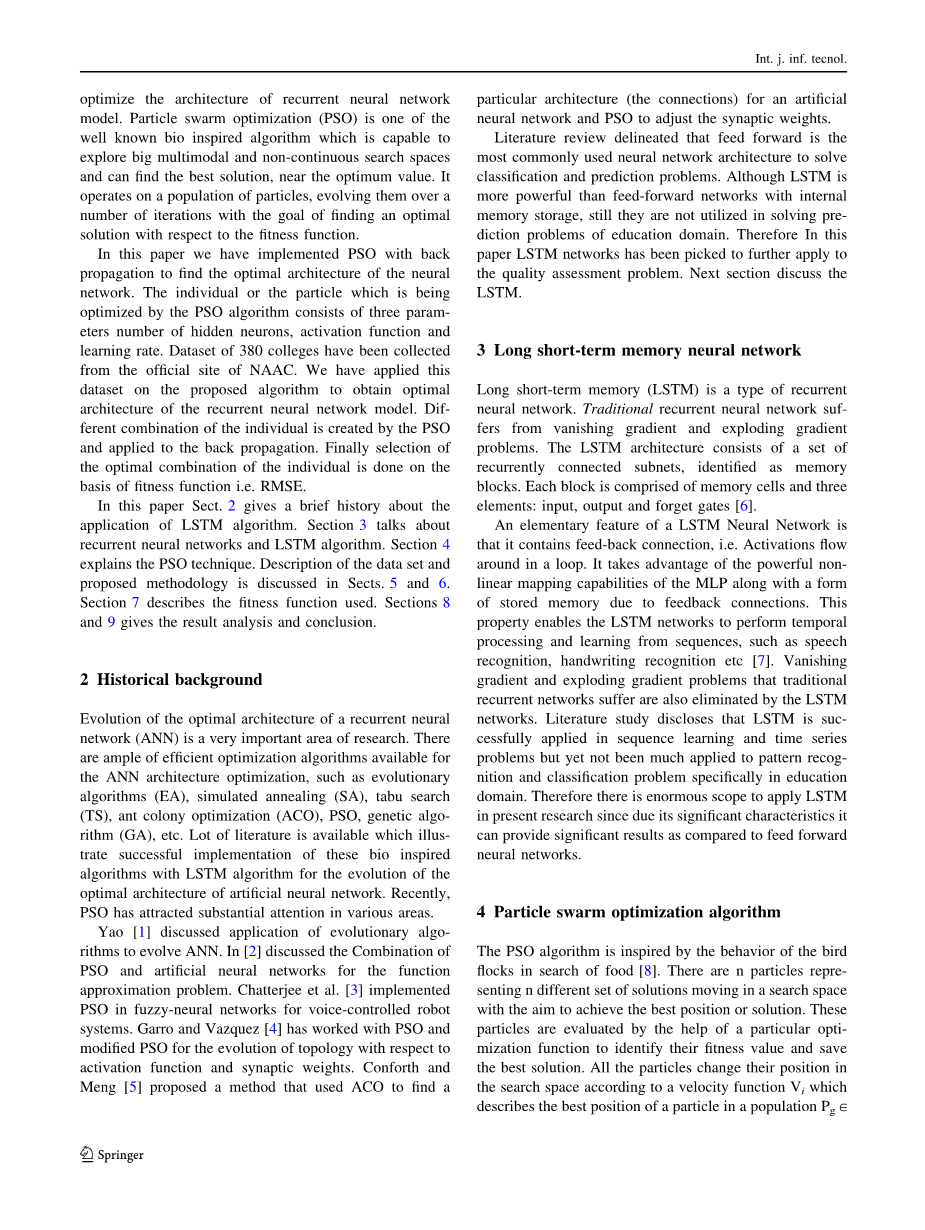 在本文中第二部分给出了LSTM算法应用的简要历史。第三部分讲述了递归神经网络和LSTM算法。第四部分解释了PSO技术。数据集和建议方法的描述在第五部分和第六部分介绍。第七部分描述使用的适应度函数,最后,第八部分和第九部分给出结果分析和结论。