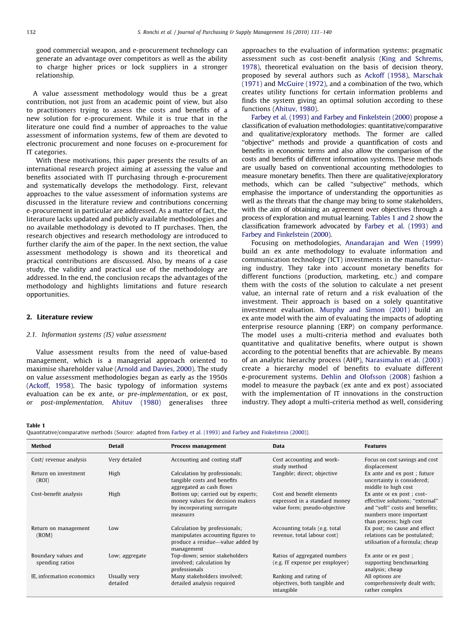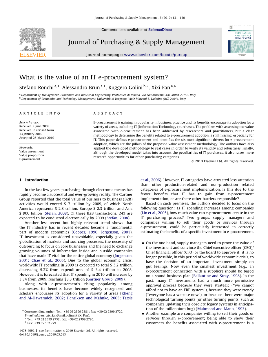 在过去的几年中,通过电子手段购买已经迅速成为一个成功的和不断增长的现实。Gartner集团报告说,企业对企业(B2B)活动的总价值将超过7兆美元2009,其中北美国代表2兆8000亿美元,欧洲2兆3000亿美元和亚洲9000亿美元(斯特凡,2008)。在这些B2B交易中,预计24%将电子化2009(斯特凡,2008)。 另一个较近期但高度相关的趋势表明,近几十年来IT业已成为现代经济的一个基本部分(库珀,1990;乔根森,2001)。IT投资被认为是不可避免的,特别是考虑到市场和采购流程的全球化,外包的必要性是集中在核心业务上,需要交换越来越多的公司内外信息,这对整个全球来说至关重要。经济(Jojson,2001;蔡等人,2005)。由于全球经济危机,2009的全球IT支出预计将达到3兆2000亿美元,比2008年度的3兆4000亿美元支出减少5.2%。然而,据预测,2010的IT支出将从2009增加3.3%,达到3兆3000亿美元(Gartner Group,2009)。 随着电子采购在企业中的日益普及,它的效益已得到广泛认可,学者们鼓励其采用多种领域(Kheng和AI HaaMeDeh,2002;Henriksen和MaNKKE,2005;TASSISetal.,2006)。 然而,IT类吸引了较少的关注比其他生产相关和非生产相关类别的电子采购实施。这是因为它从电子采购实施中获得的好处更少,还是有其他的障碍? 基于这样的前提,作者决定关注以下问题:随着企业间支出的增加(林等人,2005),电子采购在IT采购过程中能创造多少价值?两个集团,供应经理和公司愿意出售他们的商品或服务,通过电子采购,可能特别感兴趣的是正确估计的好处,在电子采购的具体投资。 一方面,供应管理者需要证明投资的价值,并说服首席执行官(CEO)/首席财务官(CFO)或董事会批准它:在这个全球经济危机的时期,不再可能基于重要投资的决定或是简单的直觉。现在即使是最小的投资(例如,与供应商的电子采购联系)应该基于一个合理的商业计划(Ballantine和杂散,1998)。过去,许多IT投资有一个更为宽松的审批程序,因为它们是战略性的(“我们不能负担不具备ERP系统”)。 因为他们是时尚的(“现在每个人都有网站”),或者因为有重大的技术转折点。(或其他转折点,比如公司更新过时在遗留系统里面期待的千年虫)(Mahmood and Mann, 1993).