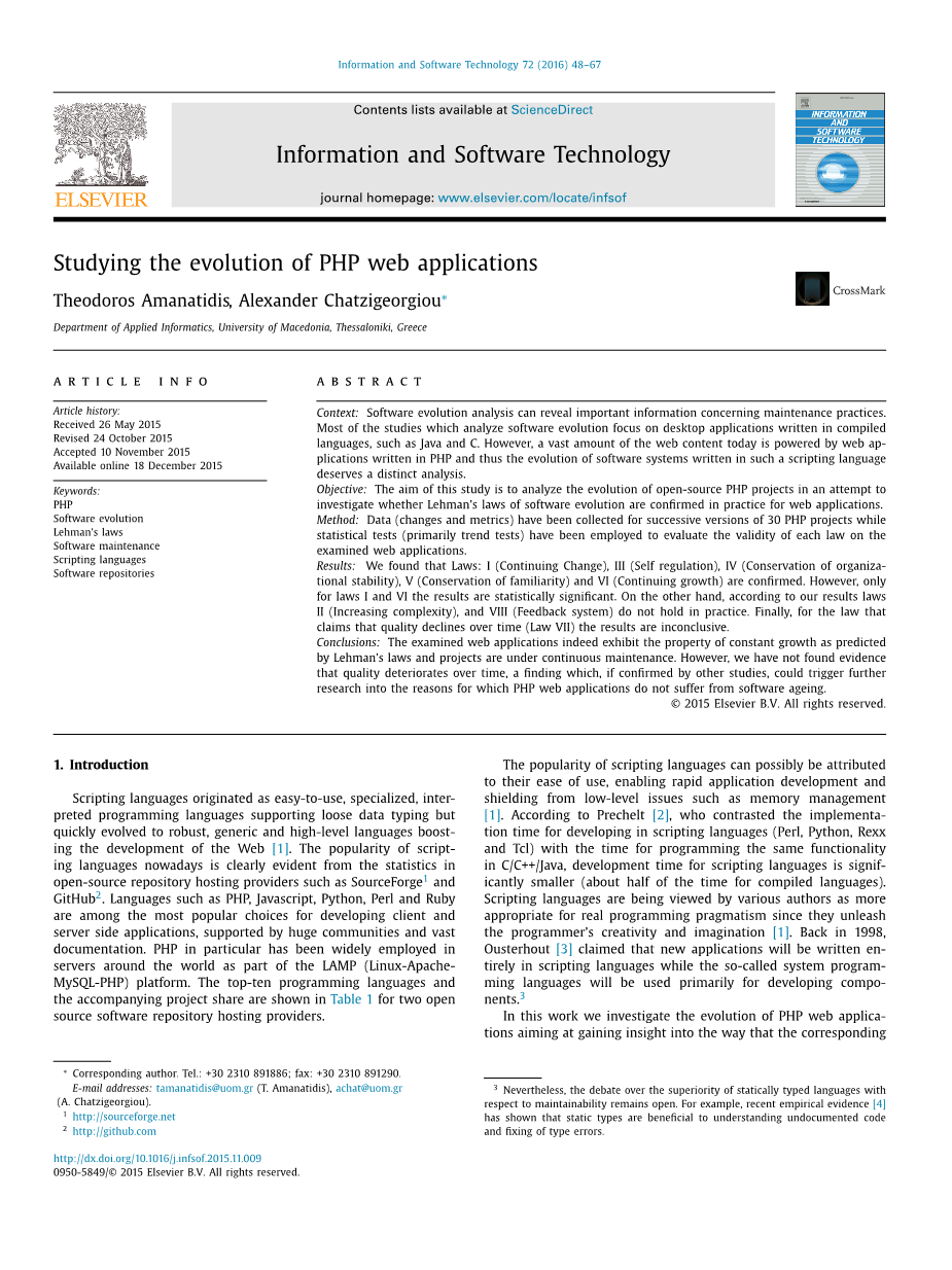 背景:软件演进分析可以揭示维护实践的重要信息。 大多数分析软件演化的研究都集中在以Java和C等编译语言编写的桌面应用程序上。但是,今天大量的Web内容都是由用PHP编写的Web应用程序提供支持,因此软件系统的演变 这样的脚本语言值得一个独特的分析目标:本研究的目的是分析开源PHP项目的演变,试图调查雷曼软件进化的规律是否在Web应用的实践中得到了证实。