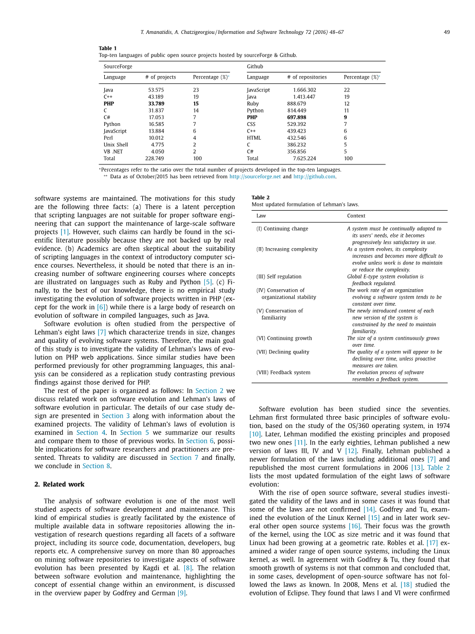 随着开源软件的兴起,一些研究调查了这些法则的有效性,并且在某些情况下发现一些法则尚未得到证实[14]。 Godfrey和Tu研究了Linux Kernel [15]的演变,并在后来的几个其他开源系统中进行了研究[16]。他们的重点是内核的增长,使用LOC作为大小度量标准,并发现Linux以几何速率增长。 Robles等人。 [17]也研究了更广泛的开源系统,包括Linux内核。根据与Godfrey&Tu的协议,他们发现系统的平稳增长并不常见,并且认为在某些情况下,开源软件的开发并未遵循已知的法则。 2008年,男士等人。 [18]研究了Eclipse的发展。他们发现,法则I和VI在实践中得到了确认(即系统以持续的工作率持续进行调整),而法则II没有得到确认(即复杂性没有呈现增长趋势)。后来,谢等人。 [19]研究了七个开源项目中所有八种进化规律的有效性。他们分析了653次正式发布和累计69年的进化,证实了8项法则中的4项(I,II,III和VI)。以色列和Feitelson [20]在2010年也研究了对Linux Kernel的法则验证。他们发现Godfrey&Tu发现的超线性增长[15,16],并由Robles等人证实。 [17]从一点变为线性。最终他们证实了第三和第四条法则,与上述研究不同。同年,Businge等人。 [21]还审查了Eclipse的21个第三方插件的法则验证。他们得出的结论是,法则I,III和VI得到确认,而V则没有。后来,Neamtiu等人[22],他的工作是谢等人的研究扩展。 [19],研究了九个开源C项目。作者仅对第1法和第6法进行了验证,反对他们先前研究中的结论[19]。在最近的一项工作[23]中,Kaur等人研究了两个C 项目,发现法则I,II,III,V,VI和VII在实践中持有,而对于IV和VIII,他们不能得出一个安全的结论。