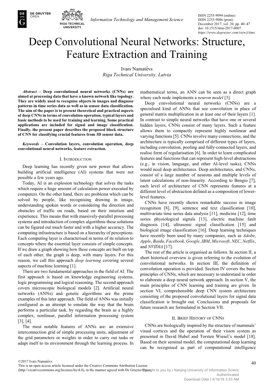 文章的其余部分组织如下。在第二节中,给出了CNN简短的历史概述,描述了卷积神经网络的演变。在第三节中,描述了卷积操作的定义。第四节描述了卷积神经网络的基本原则,这些原则对于理解深层神经网络方法是必要的。在第五节中,本文描述了CNN学习和训练的主要原则。在第六节中,提出了由所提出的用于信号数据分类的卷积层组成的易于理解的深度CNN系统体系结构。第七部分进行了总结并提出了未来研究的建议。