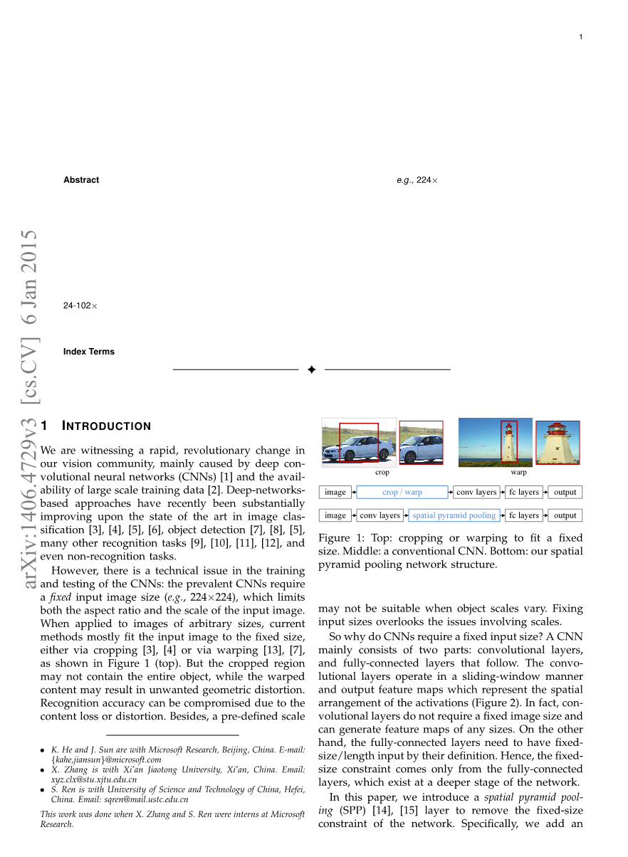 然而,这些技术在训练和测试时都有一个问题,这些流行的CNNs都需要输入的图像尺寸是固定的(比如224times;224),这限制了输入图像的长宽比和缩放尺度。当遇到任意尺寸的图像时,都是先将图像适应成固定尺寸,方法包括裁剪[3][4]和变形[13][7],如