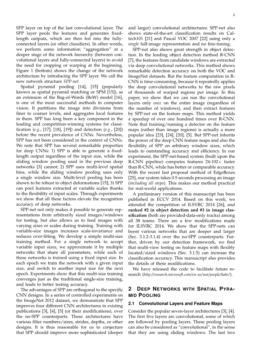 本论文的一个早先版本发布在ECCV2014上。基于这个工作,我们参加了ILSVRC 2014 [26],在38个团队中,取得了物体检测第2名和图像分类第3名的成绩(两者都提供专用数据渠道)。针对ILSVRC 2014我们也做了很多修改。我们将展示SPP-nets可以将更深、更大的网络的性能显著提升。进一步,受检测框架驱动,我们发现借助灵活尺寸窗口对特征图进行多视角测试可以显著提高分类精度。本文对这些改动做了更加详细的说明。