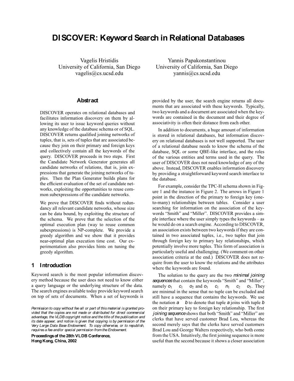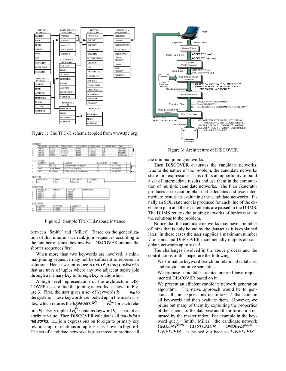 例如,考虑图1所示的TPC-H模式和图2中的实例。图1中的箭头指向表之间的主键到外键(一对多)关系的方向。 考虑用户搜索关键词“Smith”和“Miller”关联的信息。 DISCOVER提供了一个简单的界面,用户只需简单地输入关键字,就像他在搜索引擎上一样。 根据DISCOVER,如果两个关键字包含在两个关联的元组中,即两个通过外键加入到主键关系的元组,这可能涉及更多的元组,则两个关键词之间存在关联。 这种联系形式特别有用且具有挑战性。 (我们最后对其他关联标准进行评论。)DISCOVER不需要用户知道关键字和关键字的属性。