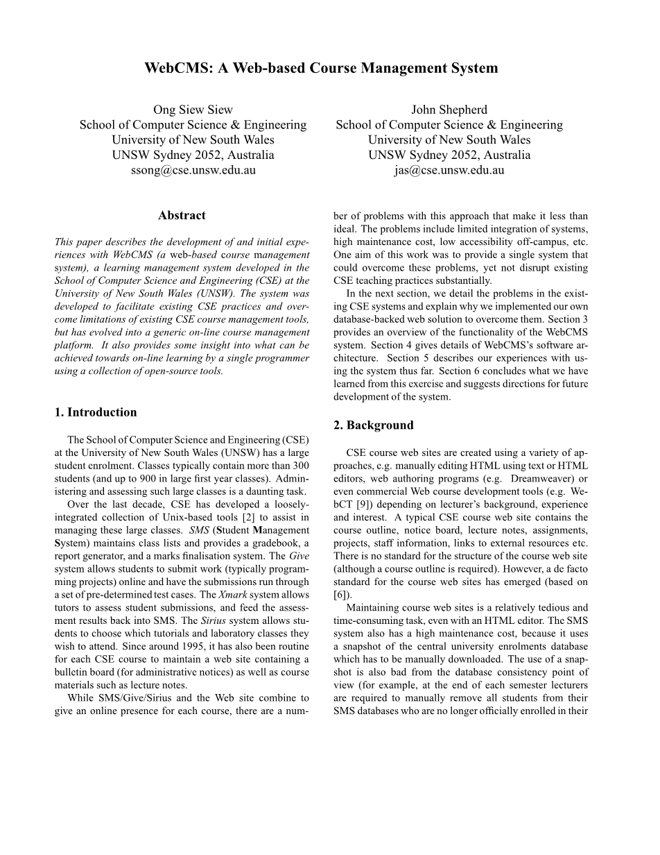 下一部分,我们细化当前存在的CSE教务系统问题,并解释我们为何要实行支持数据库的Web解决方案来解决这些问题。第三部分介绍了WebCMS系统的作用。第四部分介绍了WebCMS系统的软件架构。第五部分介绍了我们对这个系统的测试实验。第六部分总结了我们的实验并展望该系统的未来发展方向。