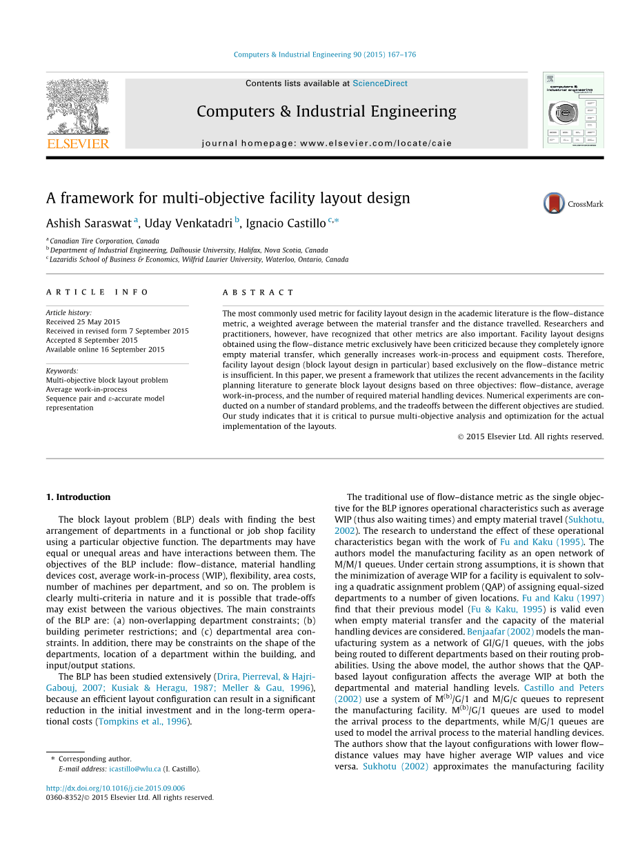 用物流距离度量作为BLP的单目标而忽略运行特性,例如平均WIP(因此也等待时间)和无效运输(Sukhotu,2002)。研究了解这些操作特性的影响开始于Fu和Kaku的研究(1995)。作者模型的制造设施是一个以M/M/1个队列的开放的网络。一定的假设下,证明了一个设备平均WIP最小化等价于求解一个在给定的位置分配大小相等的设备的二次分配问题(QAP)。Fu和Kaku(1997)发现他们以前的模型(Fu和Kaku,1995)有效,出于对无效运输和材料处理设备能力的考虑。Benjaafar(2002)模型的制造系统作为网络GI/G/1队列,在发送概率的基础上,将工作分配到不同的设备。利用上述模型,认为QAP基础布局在设备和材料的处理水平上影响平均WIP。Castillo和Peters(2002)使用一个系统的M(b)/G/1和M/G/c和米/克/克队列代表的制造工厂。M(b)/G/1个队列用于表示建模过程中的设备,而M/G/1队列用于表示建模过程中的材料处理设备。作者表明,物流距离值低的布局配置有较高的平均WIP价值,反之亦然。Sukhotu(2002)估算制造设备使用网络GI/G/1队列。对建模过程中的设备作为从材料处理设备的出发流的组合物,反之亦然。我们注意到,计算平均WIP的方法(Benjaafar,2002;Sukhotu,2002)只描述了WIP值可以计算出一个给定的布局;然而,他们并不表示如何布局可以产生最小化WIP或物流距离或措施。