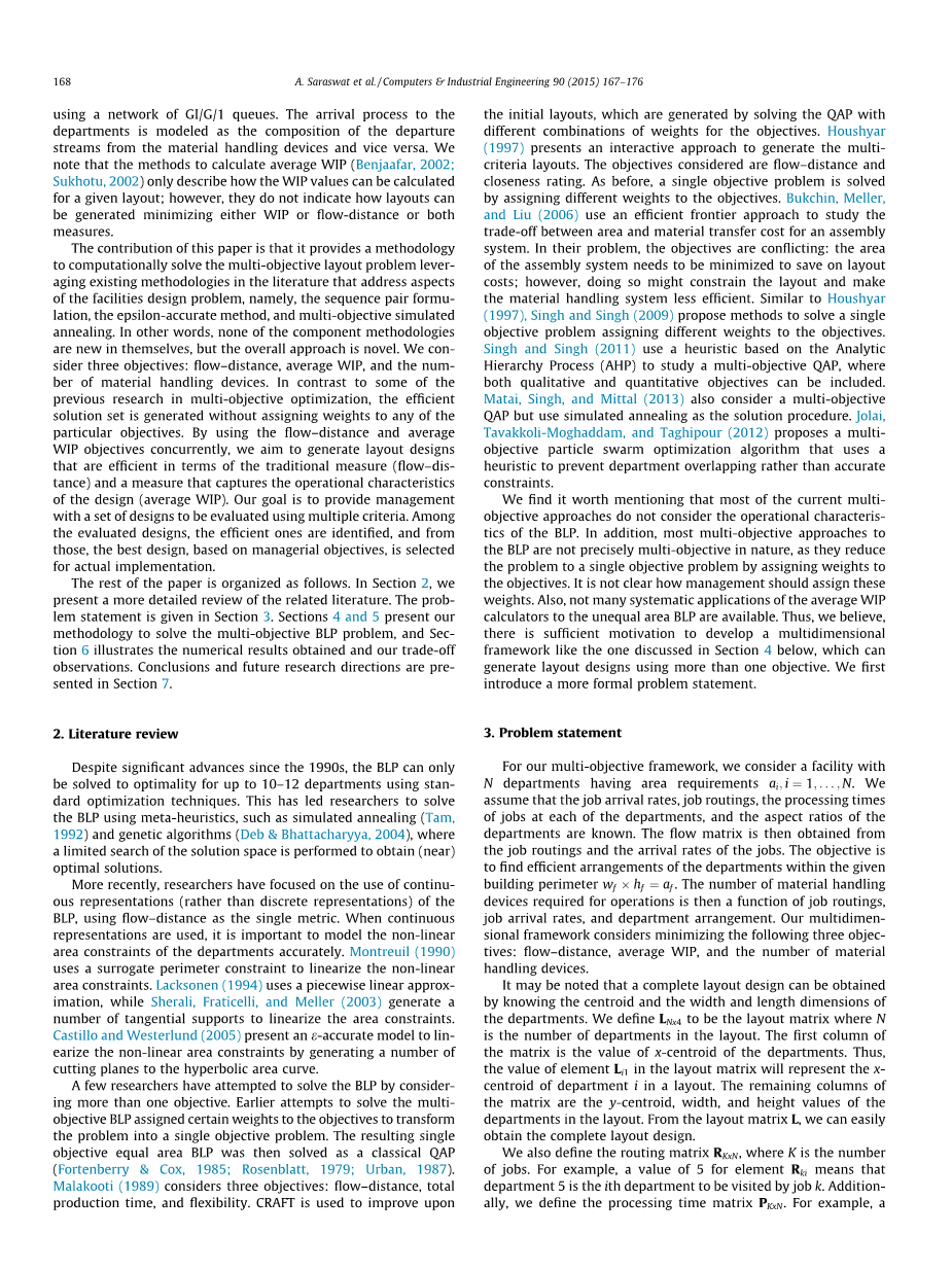 一些研究人员试图通过考虑多个目标解决BLP。早些时候试图在目标问题中分配一定的权重,用单目标问题来解决多目标规划问题。由此产生的单目标面积相等的BLP在当时作为一个经典的QAP解决方案(Fortenberry amp; Cox,1985;Rosenblatt,1979;Urban,1987)。Malakooti(1989)考虑了三个目标:物流距离,总的生产时间,灵活性。计算机化设备相关分配技术是用来改善初始布局,这是通过求解QAP与权重的不同组合产生的目标。Houshyar(1997)提出了一种接近形成多目标规划的互动。考虑的目标是物流的距离和亲密度。像以前一样,目标通过分配不同的权重来解决一个单一的目标问题。Bukchin,,Meller,和Liu(2006)使用一个有效边界的方法来研究装配系统的面积和物流运输成本之间的权衡。在他们的问题中,目标是相互矛盾的:装配系统的区域需要被最小化,以节省布局成本,但是,这样做可能会限制布局,使材料处理系统效率不高。类似Houshyar(1997),Singh和Singh(2009)提出的方法来解决单目标问题通过分配不同目标的权重。Singh和Singh(2011)使用一个基于层次的分析(AHP)的启发式算法的来研究多目标QAP,使定性和定量的目标可以包括在内。Matai,,Singh和Mittal(2013)也考虑了多目标QAP,但使用模拟退火的方法。Jolai,Tavakkoli-Moghaddam和Taghipour(2012)提出了一种多目标粒子群优化算法,采用启发式方法预防设施嵌入,而不是采用准确的约束。