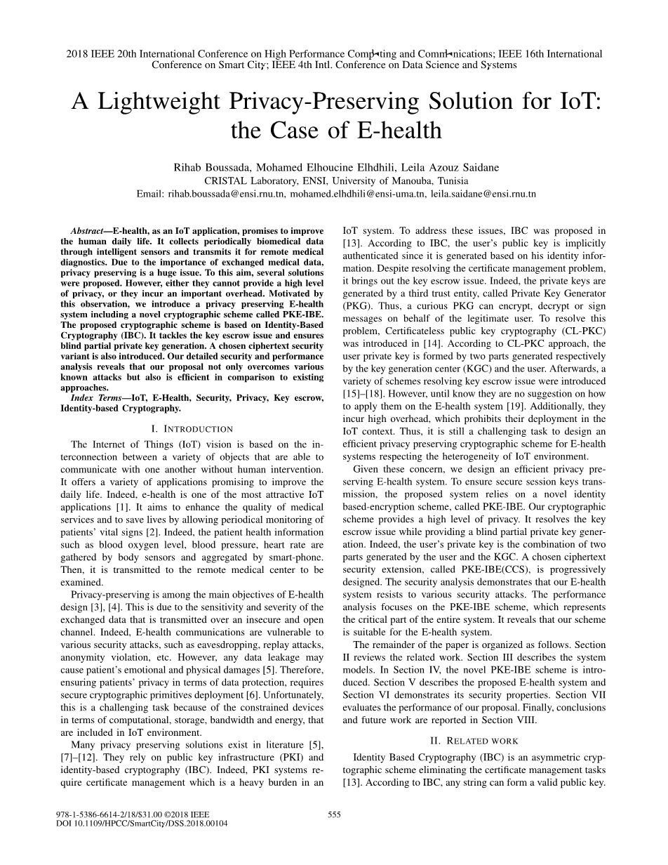 索引项-物联网、电子健康、安全、隐私、密钥托管、基于身份的加密。