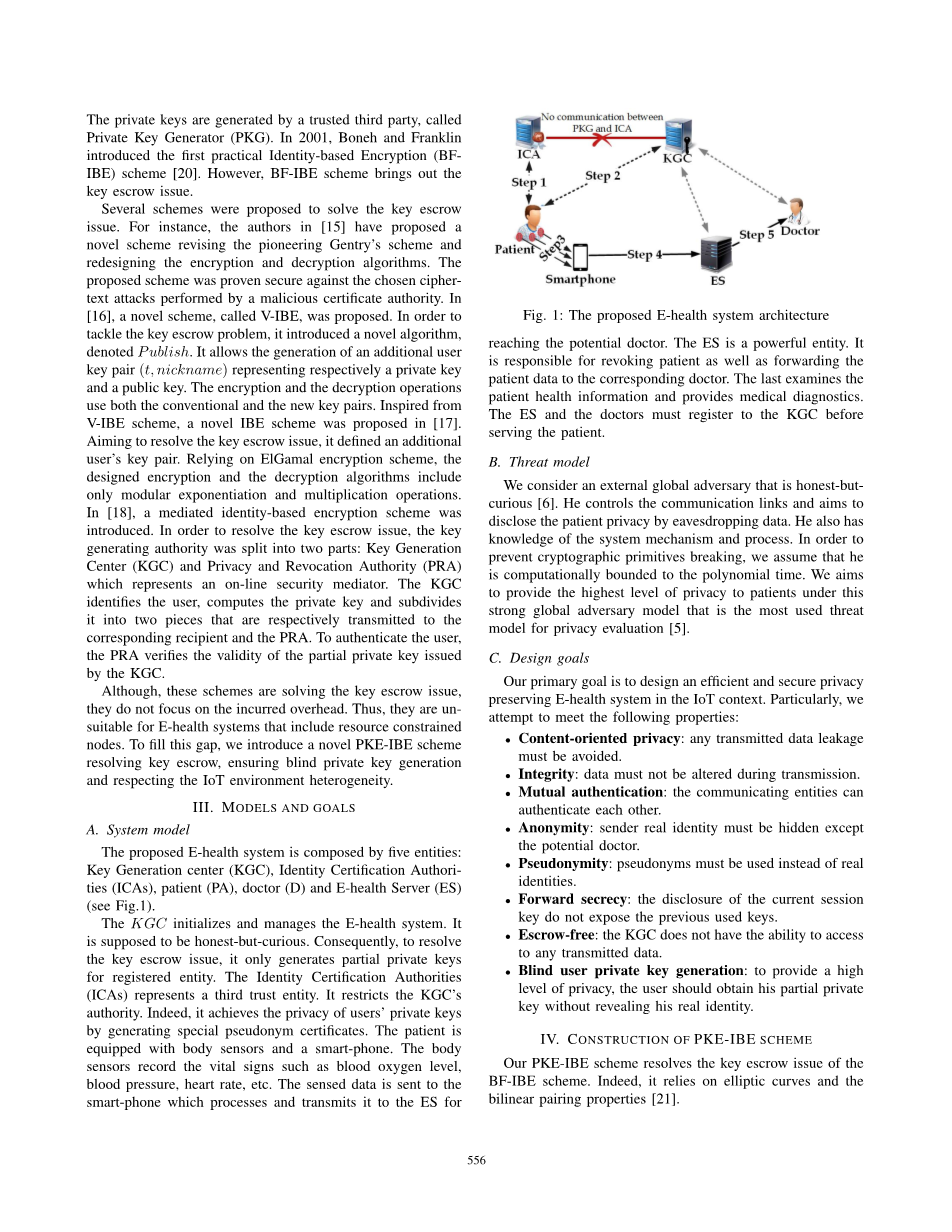 尽管这些方案正在解决密钥托管问题,但它们并不关注所产生的开销。因此,它们不适合包含资源受限节点的电子健康系统。为了弥补这一不足,我们提出了一种新的PKE-IBE方案,解决了密钥托管问题,保证了私钥的盲生成,并尊重了物联网环境的异构性。