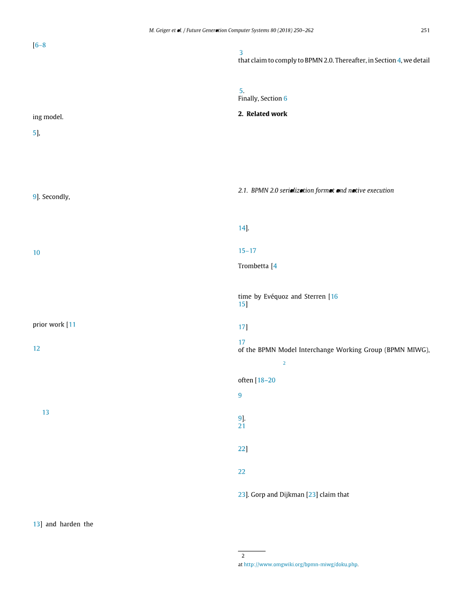 有一些研究调查了BPMN序列化格式的适用性,它的隐患以及它在BPMN建模工具中的支持情况[15-17]。当谈到BPMN 2.0执行语义和序列化格式的使用时,Chinosi和Trombetta [4]根据调查得出了第一批结果。那时,BPMN 2.0发布后不久,有40%的调查受访者声称使用了新的本机序列化格式。但是Eveacute;quoz和Sterren [16]当时对建模系统进行的分析仅提供了基本支持,尤其是对于以标准格式导出的支持。在[15]中,讨论了BPMN序列化格式规范中的问题,并对BPMN在建模工具中的支持进行了初步分析。 Kurz [17]的最新研究表明,在过去的五年中,这种情况有了很大的改善。如[17]所示,一个重要原因是BPMN模型互换工作组(BPMN MIWG)的工作,该工作组的目标是改善建模工具之间的模型可移植性。2