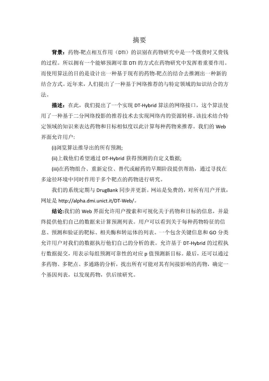 DT-Web:一个基于网络的药物-靶点相互作用及组合预测的Web应用程序.外文翻译资料 2023-02-27 09:15:56 英语原文共 11 页,剩余内容已隐藏,支付完成后下载完整资料 英语译文共 13 页,剩余内容已隐藏,支付完成后下载完整资料 资料编号:[405806],资料为PDF文档或Word文档,PDF文档可免费转换为Word 您需要先支付 30元 才能查看全部内容!立即支付 发小红书推广免费获取该资料资格。点击链接进入获取推广文案即可: Ai一键组稿 | 降AI率 | 降重复率 | 论文一键排版 PREVIOUS NEXT 您可能感兴趣的文章 基于B/S架构的高校就业信息管理系统的设计与实现开题报告 基于scrapy爬虫技术的电商平台数据分析系统文献综述 基于热点查询的地理栅格数据分析算法研究文献综述 交通数据中的数据优化文献综述 气象云图数据的解析与展示组件的开发文献综述 圆形图章的配准与鉴别研究文献综述 基于SSM框架的博客系统文献综述 基于Python的药用菊花指标预测分析文献综述 塔吊脚手架网设计与开发(后台管理系统)文献综述 高校大学生创新能力培养大数据分析与平台设计文献综述