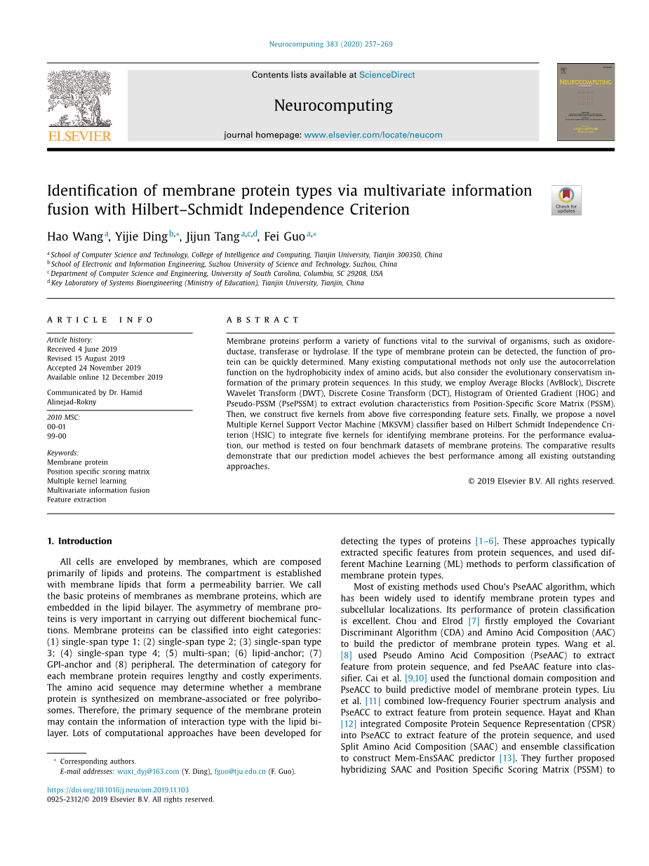基于希尔伯特独立准则的多变量信息融合鉴定膜蛋白类型外文翻译资料