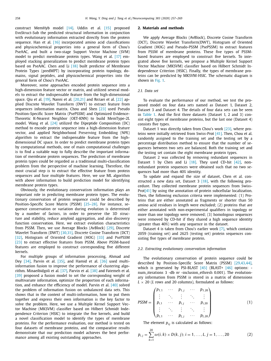 显然,进化保守性信息对膜蛋白类型的预测具有重要作用。蛋白质序列的进化守恒可以用Position-Specific Score Matrix (PSSM)来描述[25-28]。例如,进化过程中的序列守恒或变异是由许多因素决定的,为了保持三维结构和稳定性,减少淀粉样蛋白聚集,也为了发现功能守恒。在此,我们从PSSM中提取进化特征。然后,我们使用平均块(AvBlock)[29]、离散小波变换(DWT)[30,31]、离散余弦变换(DCT)[32]、梯度直方图(HOG)[33]和PsePSSM[23]从PSSM中提取有效特征。利用上述基于pssm的特征构造相应的5个不同的内核。