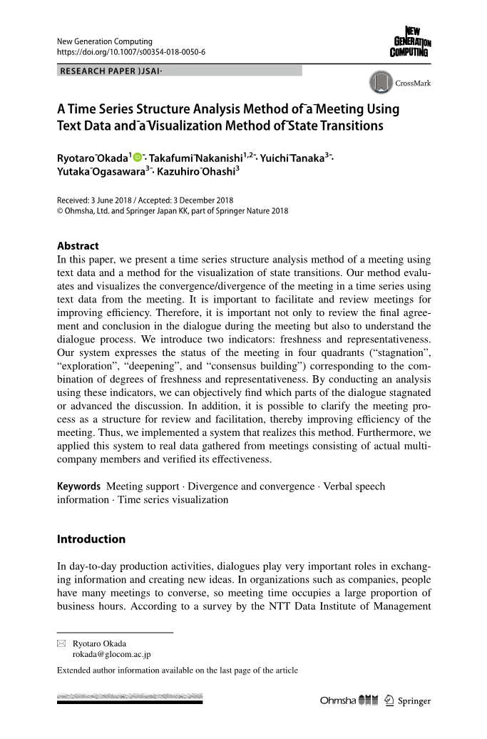 在不久的将来,随着语音识别技术的进步,从语音数据中提取文本数据将变得更加容易。因此,基于语言信息的方法将成为对话分析研究的主流。语言研究能够对内容和意义进行深入分析和评估。此外,通过积累会议日志的文本数据,我们将能够分析多个会议以及它们是如何连接的。可以查看项目进度并分析项目中每次会议的效率。