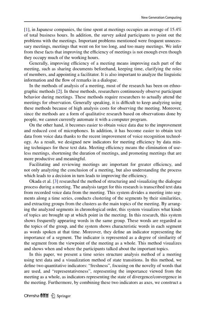 冈田等人研究了在会议期间构建和可视化对话过程的方法。本研究的分析对象是从会议记录的语音数据中转录的文本数据。该系统将会议沿时间序列划分为多个片段,根据片段的相似性对片段进行聚类,从聚类中提取群组作为会议的主要议题。通过按时间顺序排列分析的片段,该系统可以可视化会议中的哪个时间点提出的主题类型。在这项研究中,该系统显示了同一组中频繁出现的单词。这些词被视为群组的话题,系统将每个片段中的特征词显示为当时所说的词。此外,他们定义了一个代表细分市场重要性的指标。从会议整体的观点来看,该指标表示为段的相似度。这种方法可视化并显示参与者谈论重要话题的时间和地点。