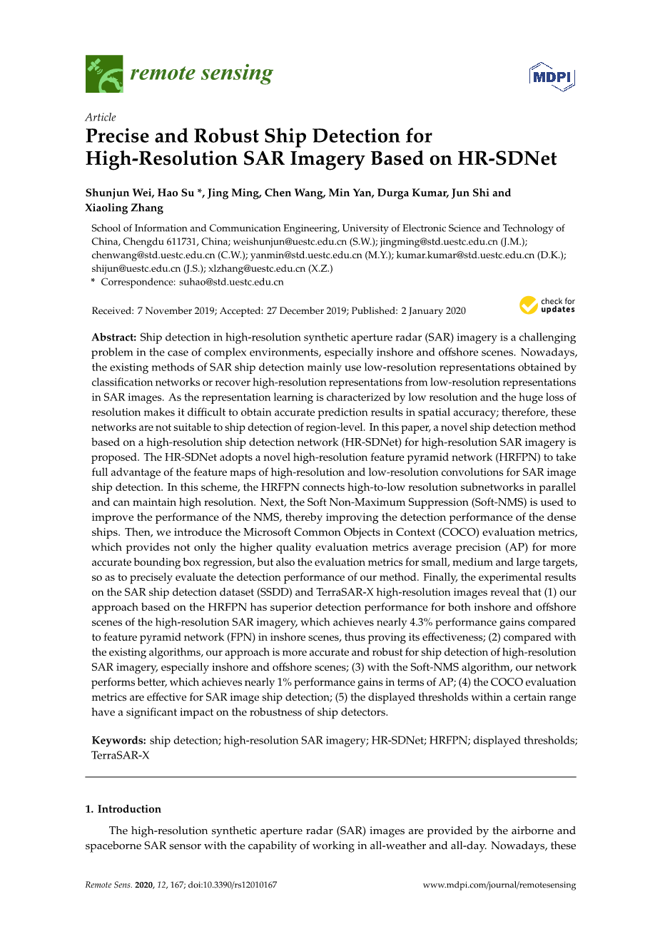 摘要:高分辨率合成孔径雷达(SAR)图像中的船舶检测是复杂环境下的一个具有挑战性的问题,特别是近岸和近海场景。目前,现有的SAR船舶探测方法主要采用分类网络获得的低分辨率表示,或从 SAR 图像中的低分辨率表示中恢复高分辨率表示。 由于表示学习的特点是分辨率低,分辨率损失巨大,难以在空间精度上获得准确的预测结果;因此,这些网络不适合于区域级的船舶检测。 本文提出了一种 基于高分辨率船舶检测网络(HR-SDNet)的高分辨率SAR图像船舶检测方法。 HR-SDNet 采用一种新的高分辨率特征金字塔网络(HRFPN),充分利用高分辨率和低分辨率卷积的特征映射来进行SAR图像舰船检测。 在该方案中,HRFPN并行连接高分辨率到低分辨率的子网,并能保持高分辨率。其次,采用Soft-NMS来提高NMS的性能,从而提高密集船舶的检测性能。然后,我们介绍了Microsoft Common Objectsin Context(COCO)评估度量,它不仅为更准确的包围盒回归提供了更高质量的评估度量平均精度(AP),而且还为中小型和大型目标提供了评估度量,从而精确地评估了我们的方法的检测性能。 最后,在SAR船探测数据集(SSDD)和 TerraSAR-X 高分辨率图像上的实验结果表明:(1) 我们基于 HRFPN 的方法对高分辨率 SAR 图像的近海和近岸场景具有优越的检测性能,达到近海与近岸场景中的特征金字塔网络(FPN)相比,性能增益为 3%,从而证明了其有效性;(2)与现有算法相比,我们的方法对高分辨率 SAR 图像,特别是近海和近岸场景的船舶检测更加准确和稳定;(3)采用 Soft-NMS 算法,我们的网络性能更好,在AP方面实现了近1%的性能增益;(4)COCO 评价指标对 SAR 图像船舶检测有效;(5)在一定范围内显示的阈值对船舶探测器的稳定性有显著影响。