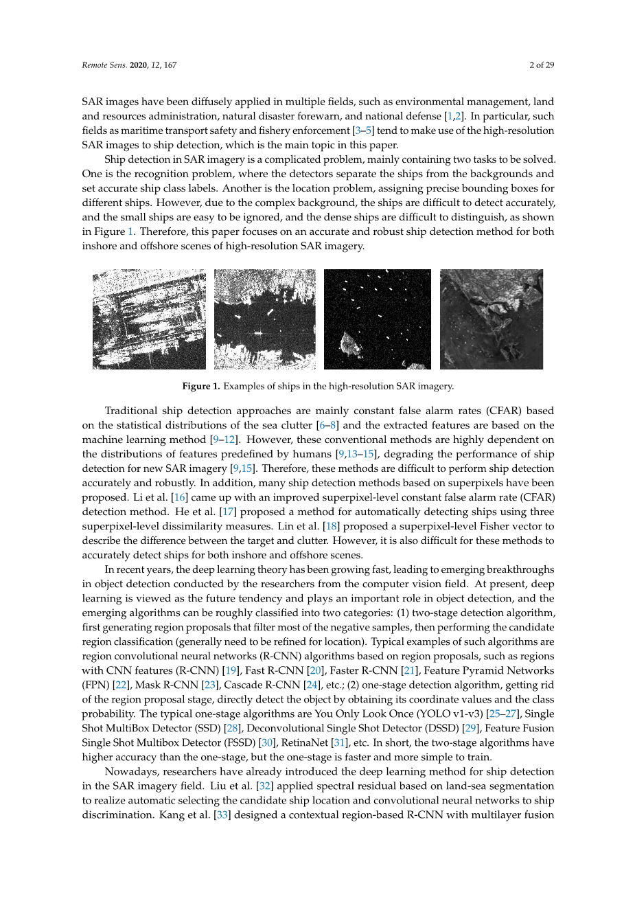 目前,研究人员已经在 SAR 图像领域引入了船舶检测的深度学习方法。 刘等[32]应用基于陆海分割的光谱残差,实现了候选船舶位置的自动选择和卷积神经网络进行船舶识别。康等人。设计了一种基于上下文区域的多层融合 R-CNN,以提高检测小船舶的性能。 [34]提出了一种改进的具有 CFAR 的fast R-CNN 方法,为小船检测中的多尺度问题提供了一种解决方案。 李等人。 [35]将faster R-CNN 方法引入到船舶检测领域,并采用了特征融合等四种策略,同时建立了适合于证明新检测方法的船舶相关数据集。 王等人。 [36]采用单镜头多盒检测器,获得了较高的检测精度和相对较高的速度,并在过程中加入了转移学习,以减少假阳性。[37]采用 YOLOv2检测SAR图像中的船舶,减少了计算费用。 王等人,[3]针对多尺度问题,缓解了统计模型或提取特征的依赖性,利用RetinaNet获得了较高的船舶检测精度。 [38]提出了一种网格卷积神经网络来解决实时检测问题。 崔等人。提出了一个密集的注意金字塔网络,用于高分辨率SAR图像中的多尺度船舶检测。