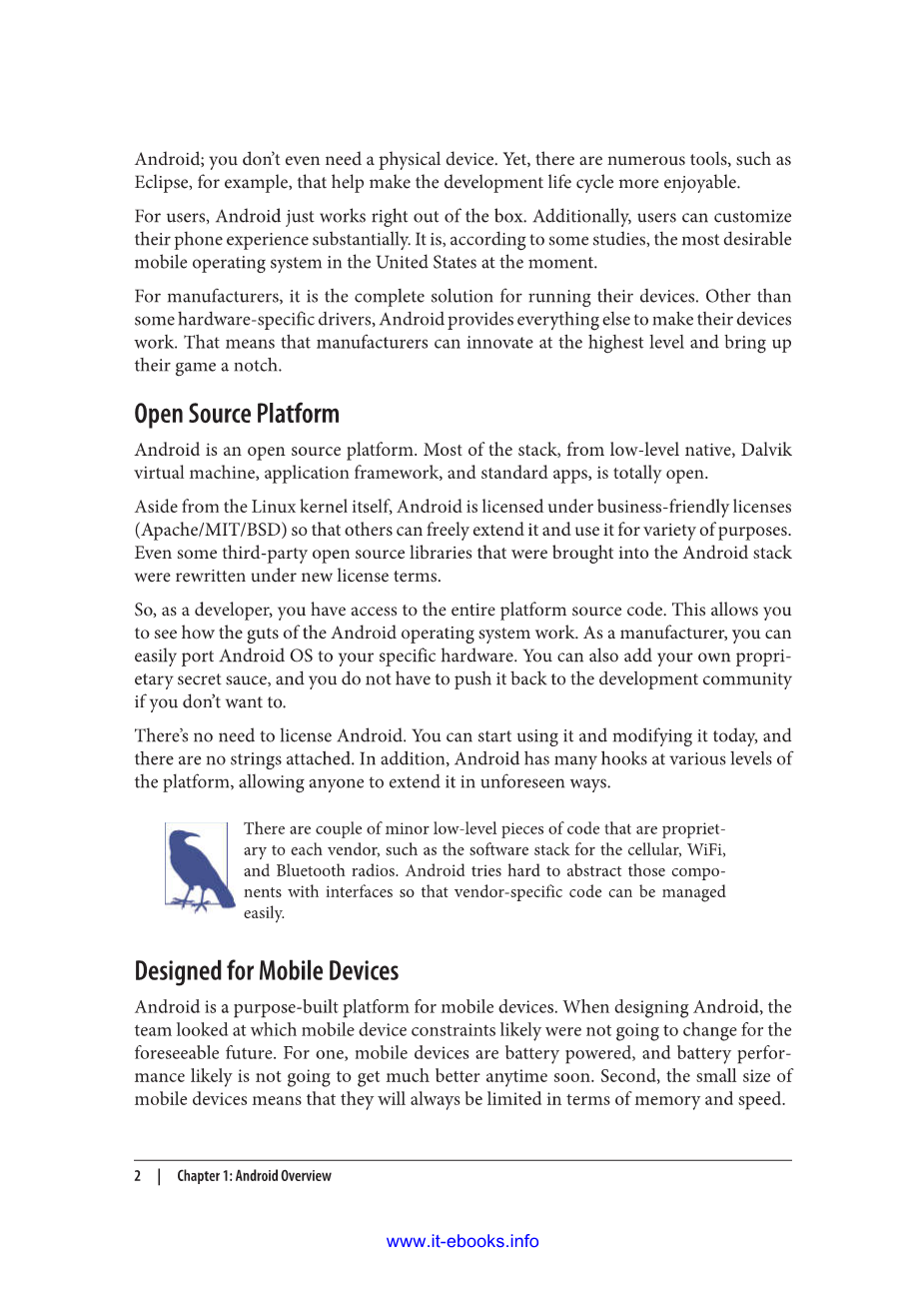 所以,作为一名开发人员,你有权利访问这整个平台的源代码。这可以让你看到安卓的操作系统内部的工作机理。作为一名制造商,你可以轻松地将整个安卓操作系统移植到你的特定的硬件中去。你也可以添加自己专属的独家的秘技,而且,如果你自己并不愿意,你也可以不把他退回到开发社区。