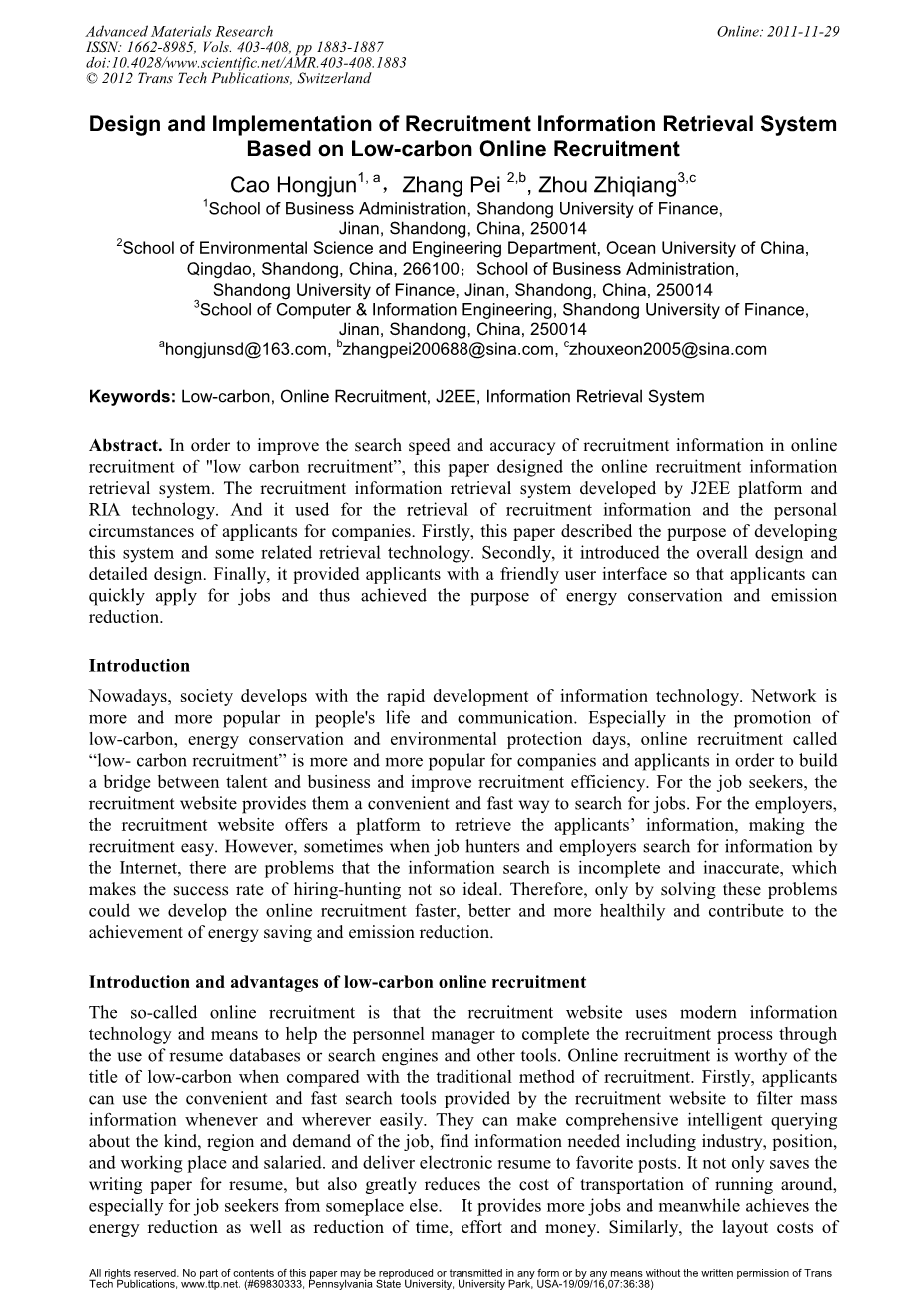 摘要:了提高“低碳招聘”网络招聘中招聘信息的搜索速度和准确性,本文设计了网上招聘信息检索系统。基于J2EE平台和RIA技术开发的招聘信息检索系统。它用于检索招聘信息和应聘者的个人情况。本文首先阐述了开发该系统的目的和相关的检索技术。其次,介绍了系统的总体设计和详细设计。最后,为申请人提供一个友好的用户界面,使申请人能迅速申请工作,从而达到节能减排的目的。