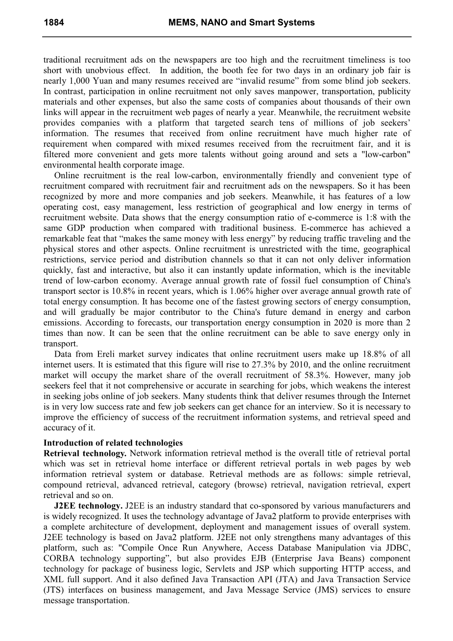 网上招聘是真正的低碳、环保、便捷的招聘方式,与招聘会和招聘广告相比,在报纸上更是如此。因此,越来越多的公司和求职者已经认识到这一点。同时,在招聘网站方面,它具有操作成本低、管理方便、地域限制小、能耗低等特点。数据显示,电子商务的能耗比为1:8同GDP生产与传统商务相比。电子商务通过减少交通出行和实体商店等方面,取得了“赚钱少,精力少”的显著成就。网上招聘不受时间、地域限制、服务周期和分销渠道的限制,既能快速、快速、互动地传递信息,又能即时更新信息,是低碳经济发展的必然趋势。对中国的交通运输行业的化石燃料消费量的年均增长率为10.8%,近几年来,这是1.06%高于能源消费总量的年均增长率。它已成为能源消费增长最快的部门,并将逐步在中国未来的能源需求和碳排放的主要贡献者。据预测,我们2020的运输能源消耗是现在的2倍多。可见,网上招聘只能在运输中节约能源。来自艾瑞市场调查数据显示,网络招聘的用户占所有互联网用户18.8%。据估计,这一数字将上升到27.3%的2010,而网上招聘市场将占据整个招聘市场份额58.3%然而,许多求职者觉得求职并不全面或准确,这削弱了求职者在网上求职的兴趣。许多学生认为通过互联网投递简历的成功率很低,求职者很少有机会得到面试机会。因此,提高招聘信息系统的成功率,提高检索速度和准确性是十分必要的。