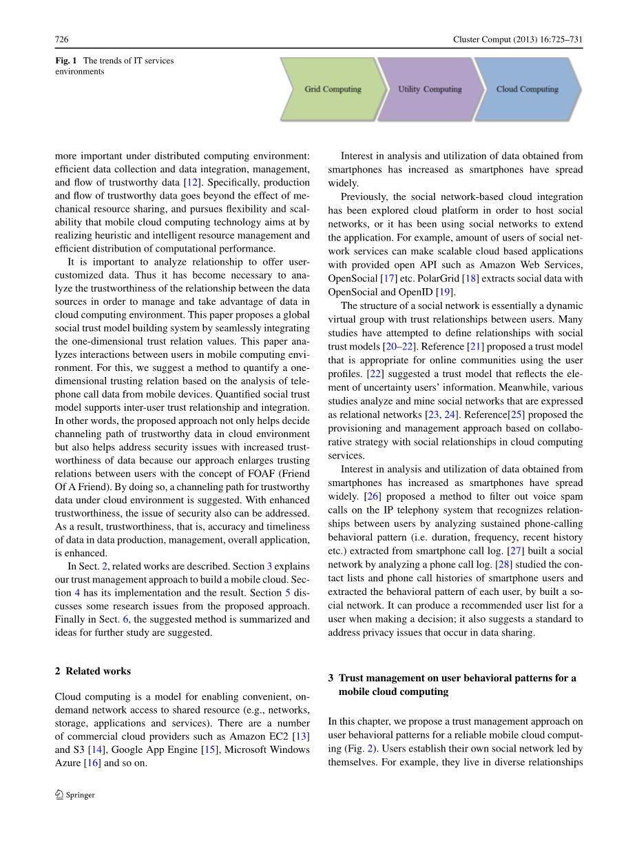 社交网络的结构本质上是具有用户之间的信任关系的动态虚拟组。 许多研究尝试定义与社会信任模型的关系[20-22]。 参考文献[21]提出了一种适用于使用用户配置文件的在线社区的信任模型。[22]建议一个反映不确定性用户信息的元素的信任模型。同时,各种研究分析和挖掘被表示为关系网络的社交网络[23,24]。 基于与云计算服务中的社会关系,参考文献[25]提出了一种协作策略的供应和管理方法。