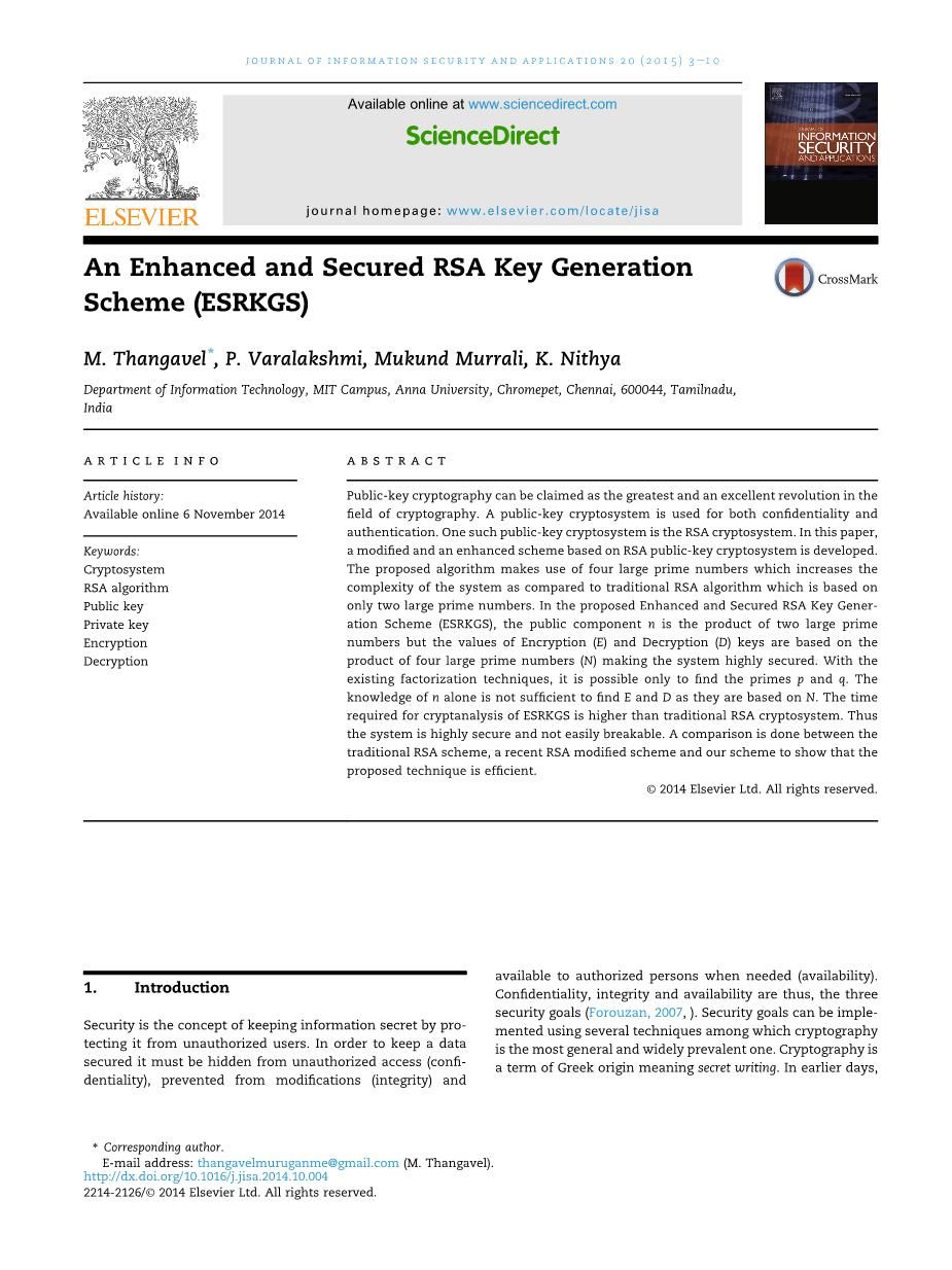 在本文中,提出了一种增强的rsa密钥生成方案(esrkgs),以减少在rsa情况下可能发生的直接攻击。该方案基于四个大素数而不是两个。此外,密钥不直接依赖于公钥n。因此在所提出的方法中任何类型的暴力攻击都是困难的。