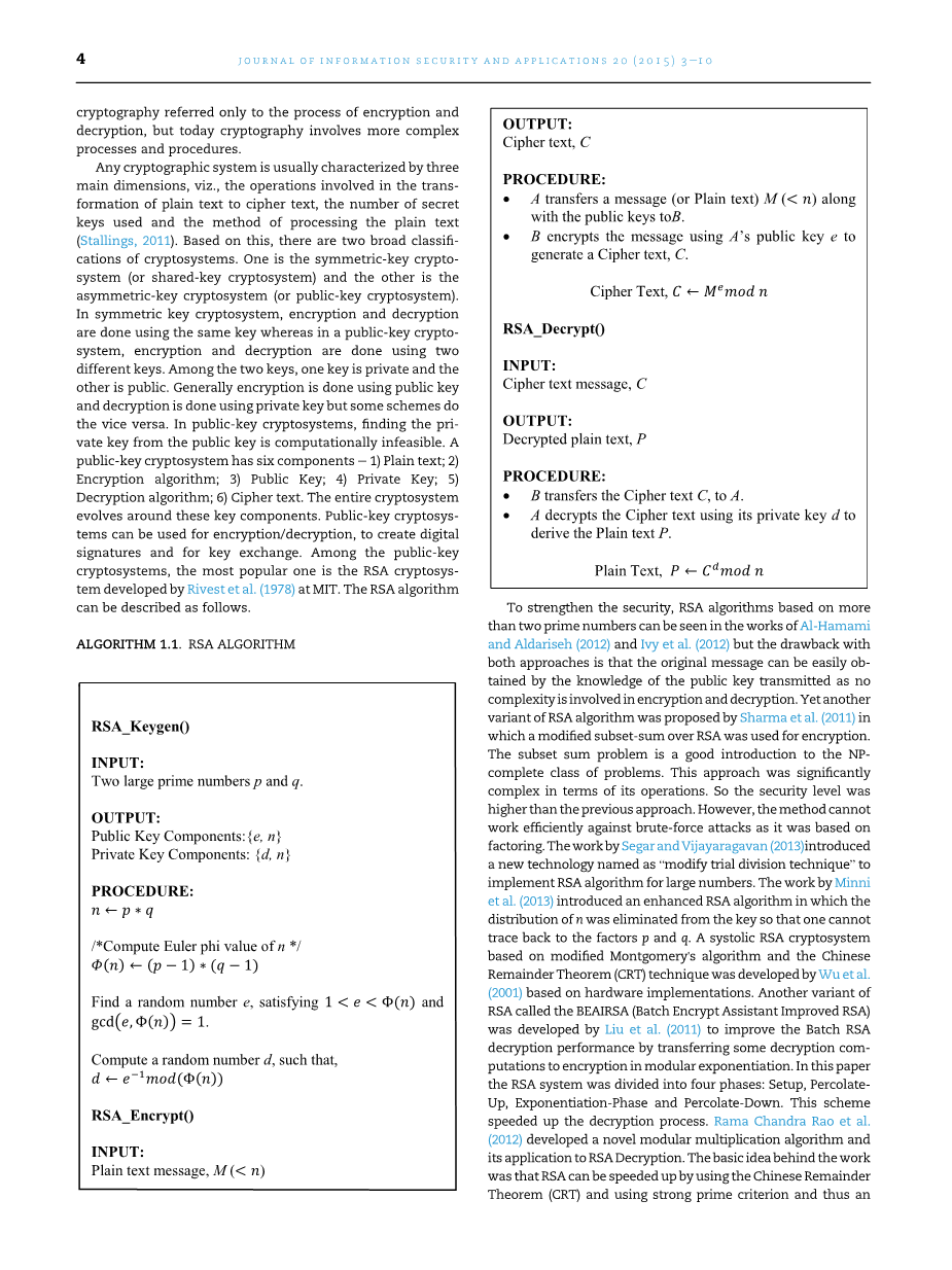 为了加强安全性,基于两个质数的RSA算法可以在AL—Hamami和Aldariseh(2012)和Ivyetal的作品中看到,但是这两种方法的缺点是,由于加密和解密不涉及复杂性,所以可以通过传输公钥的知识容易地获得原始消息。夏尔马等人提出了RSA算法的另一种变体,在RSA上使用改进的子集和加密。子集和问题是对np-完整类问题的一个很好的介绍。这种方法在操作上非常复杂。所以安全级别高于以前的方法,但由于基于因式分解的原因,该方法无法有效地抵御暴力攻击。本文通过引入一种名为“修改试用分割技术”的新技术来实现大数量的rsa算法。该工作通过引入增强的rsa算法,其中从关键字中消除了n的分布,从而不能追溯到因子p和q。基于改进的蒙哥马利算法的收缩RSa密码体制和基于硬件实现的中国剩余定理(crt)技术。 rsa的另一个变种叫做beairsa(批量加密助手改进的rsa),它通过传输一些解密计算求幂来提高批量rsa解密性能。本论文rsa系统分为四个阶段:设置,渗流,指数和渗出。这个方案加速了解密过程。开发了一种新颖的模乘算法及其应用加密算法。后面的工作是通过使用中国剩余定理和强素数标准加速RSA, 引入高效的模乘算法。介绍一种新的算法(sa_rsa),该算法提出了乔东函数的设计,并将它们应用于rsa公开密钥密码体制,其中一个公钥和一个私钥用于开发协议以提供安全通信,由Majan和Easo(2012)介绍。该计划表明,密钥大小的增加会增加系统的安全性。