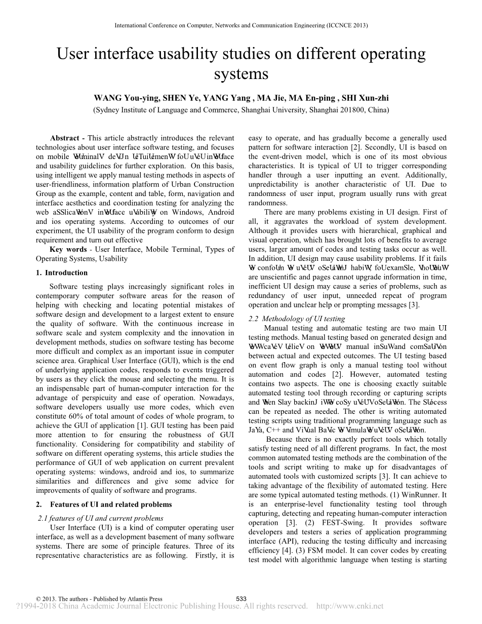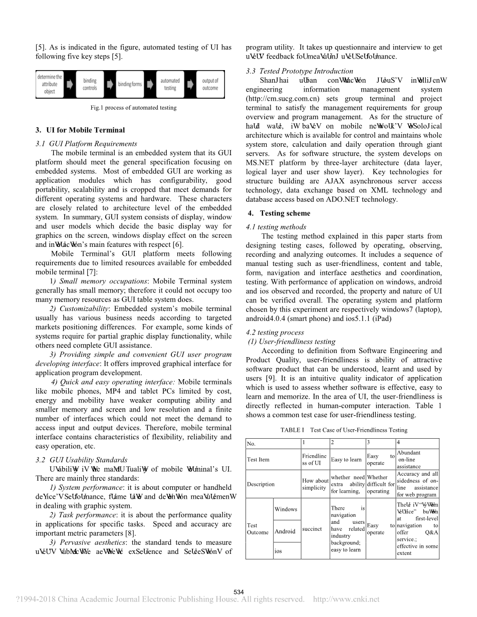 本文解释的测试方法从设计测试案例开始,然后是操作,观察,记录和分析结果。 它包括一系列的手动测试,如用户友好性,内容和表格,表单,导航和界面美学和协调,测试。 随着windows,android和ios的应用性能的观察和记录,UI的属性和性质可以被整体验证。 本次实验选择的操作系统和平台分别为windows7(笔记本),android4.0.4(智能手机)和ios5.1.1(iPad)。