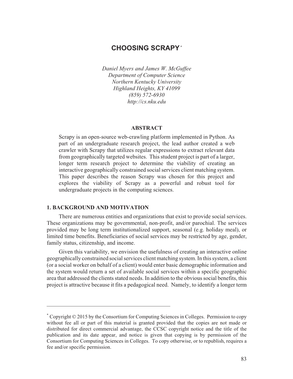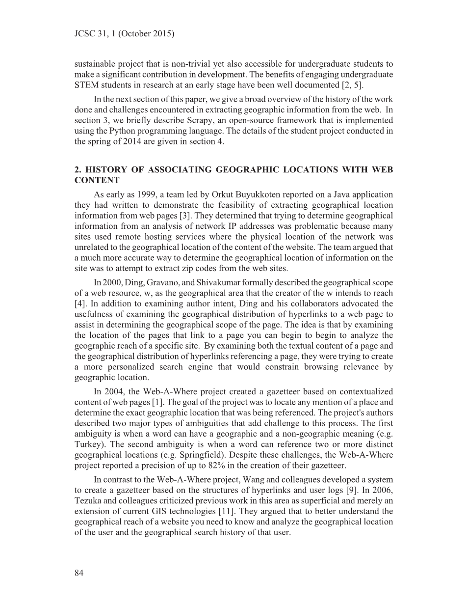在本文的下一部分中,我们将广泛的概述从Web上提取地理信息时所遇到的工作和遇到的挑战。在第3节中,我们简要介绍Scrapy,一种使用Python编程语言实现的开源框架。第四部分详细介绍了2014年春季开展的学生项目。