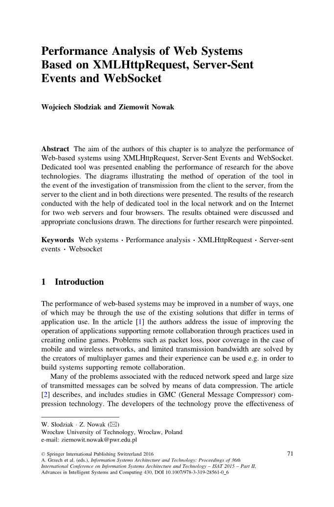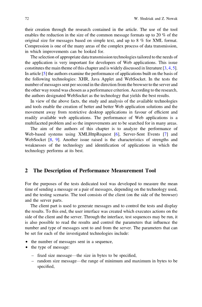本文作者的目标是分析使用XMLHttpRequest[6], Server-Sent事件[7]和WebSocket[8, 9]的基于网络的系统的性能。另一个提出的论点是,技术的优劣特征和技术表现最好的应用情况的确认。
