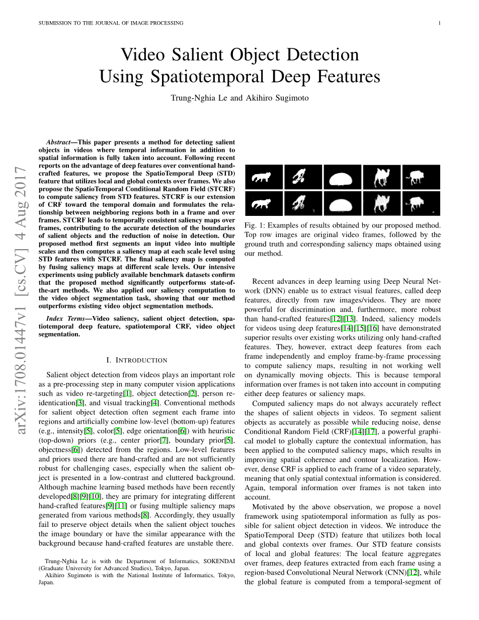 本文提出了一种检测视频中显著对象的方法,其中除了空间信息之外,充分考虑了时间信息。继最近的报告对传统手工制作的特点的深度特征的优势,我们提出了时空深度(STD)的特点,利用本地和全局上下文的框架。我们还提出了时空条件随机场(STCRF)来计算STD特征的显著性。STCRF是CRF向时域扩展,并在帧和帧之间形成相邻区域之间的关系。STCRF导致帧上的时间一致显著性图,有助于准确检测突出对象的边界和减少检测中的噪声。我们提出的方法首先将输入视频分割成多个尺度,然后利用STCRF的STD特征在每个尺度水平上计算显著图。最后的显著性图是通过在不同的尺度水平融合显著性图来计算的。我们使用公开可用的基准数据集的密集实验证实,所提出的方法显著优于现有技术的方法。我们还将我们的显著性计算应用到视频对象分割任务,表明我们的方法优于现有的视频对象分割方法。