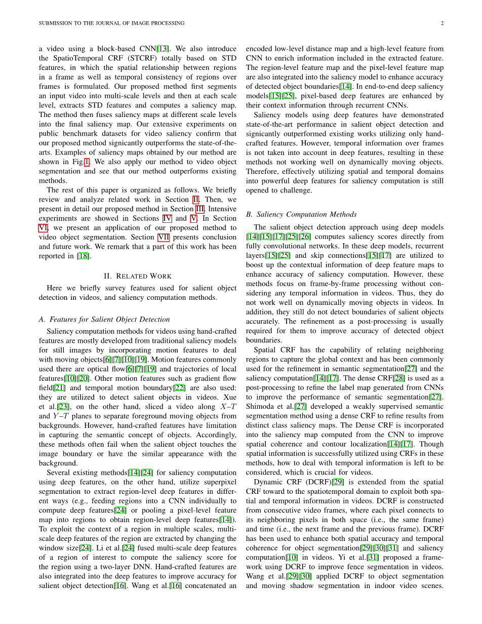 SIFT流特征被结合到DCRF中以从视频中检测突出对象[10]。然而,DCRF是像素级稠密图;因此,由于内存消耗大,通常只使用两个连续帧来构造。此外,由于DCRF的能量函数完全基于经典手工制作的特征,如颜色和光流的组合,DCRF缺乏利用语义上的空间和时间信息。我们提出的STCRF不同于DCRF,因为STCRF仅使用STD特征在区域上定义,使得它能够处理更连续的帧,并且利用更少的计算成本更具语义地利用空间和时间信息。