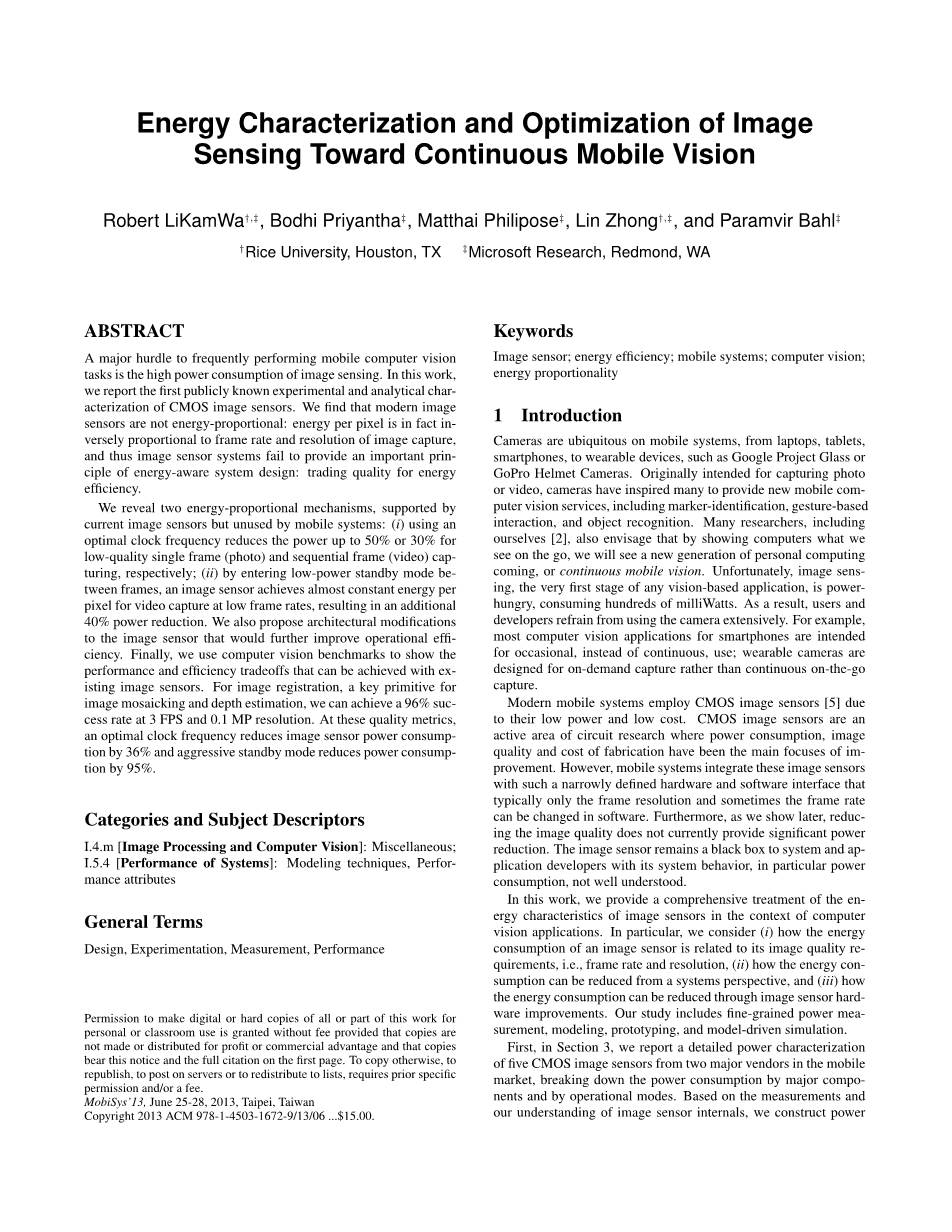 相机在移动系统上无所不在,从笔记本电脑,平板电脑,智能手机,到可穿戴设备,如Google Project Glass或GoPro头盔相机。 最初打算捕获照片或视频,摄像机激发了许多人提供新的移动计算机服务,包括标记识别,基于姿势的交互和对象识别。 许多研究人员,包括我们自己[2],也设想通过计算机显示我们在旅途中看到的,我们将看到新一代的个人计算即将来临或连续的移动视觉。 不幸的是,图像感测,任何基于视觉的应用程序的第一阶段,是耗电量高,消耗数百毫瓦。 因此,用户和开发人员不再广泛地使用相机。 例如,用于智能手机的大多数计算机视觉应用旨在偶尔使用,而不是连续使用; 可穿戴式相机被设计用于按需捕获而不是连续的即时捕获。