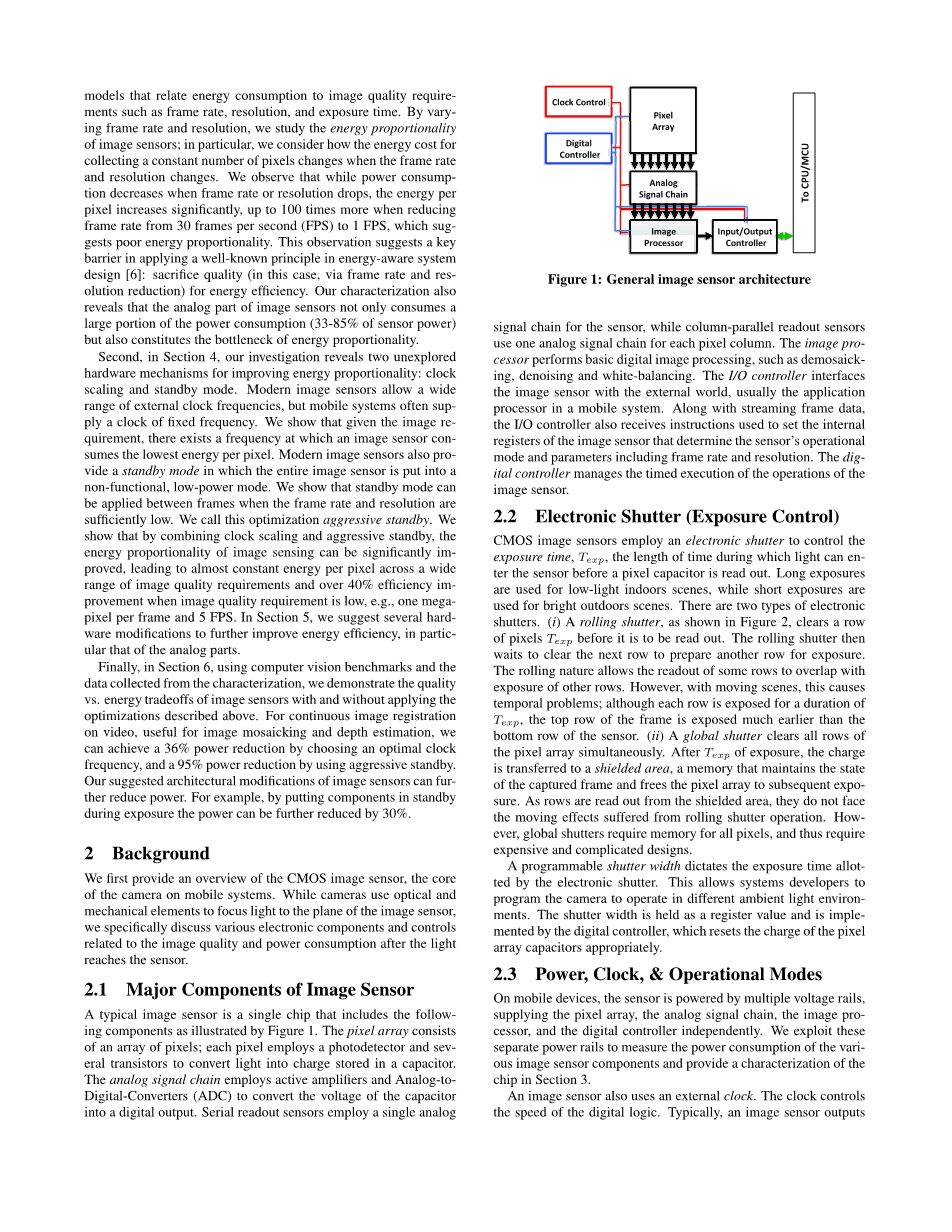 首先,在第3节中,我们报告了来自移动市场两个主要厂商的五个CMOS图像传感器的详细功率特性,打破了功耗的主要成分和操作模式。基于测量和我们对图像传感器内部的理解,我们构建了能量消耗与图像质量要求(如帧速率,分辨率和曝光时间)相关的功率模型。通过改变帧速率和分辨率,我们研究图像传感器的能量比例;特别地,我们考虑当帧速率和分辨率改变时用于收集恒定数量的像素的能量成本如何改变。我们观察到当帧速率或分辨率下降时功耗降低,每个像素的能量显着增加,当将帧速率从30帧每秒(FPS)降低到1FPS时,高达100倍,这表明能量比例性较差。这一观察表明在能量感知系统设计中应用众所周知的原则的关键障碍[6]:牺牲质量(在这种情况下,通过帧速率和分辨率降低)提高能效。我们的特性还表明,图像传感器的模拟部分不仅消耗大部分的功耗(传感器功率的33-85%),而且构成能量比例的瓶颈。