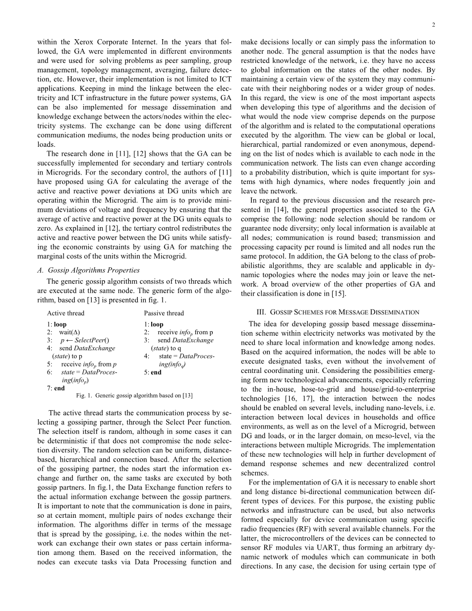 第一个实际执行的大会是在 1987 [10]。目标是在Xerox公司互联网内启用数据库复制。这些年GA在不同的环境中实施并用于解决问题作为抽样,集团管理,拓扑管理,平均,故障检测,然而,它们的实现不限于ICT 应用程序。记住电子在未来电力系统中的三重性和ICT基础设施也可以实现消息传播和 电子元件内的角色/节点之间的知识交换是三元系统。交换可以使用不同的通信介质,所述节点是生产单元或负载。
