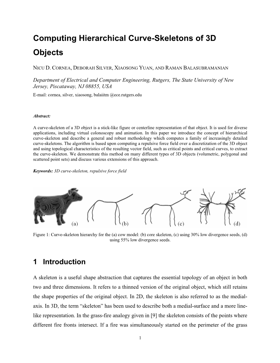 在本文中,我们引入一个 分级曲线骨架 的概念, 并提出了一种方法, 从一般的3D对象提取这些曲线骨架。 我们还演示了这种技术 适用于所有类型的3D对象:多边形表面表示,体积数据集 和散点集。 还讨论了网格分解和动画的扩展。该算法应用于许多3D对象,其中一些在本文中显示(其他的可以在我们的网站上看到[43])。 该方法基于使用排斥力场 [2] [12]和概念从矢量场拓扑[21]提取曲线骨架架族。 该方法自动检测骨架中的“节点”,这可以用作分支点 虚拟导航[45]或动画关节[15] [16] [39] [42]。