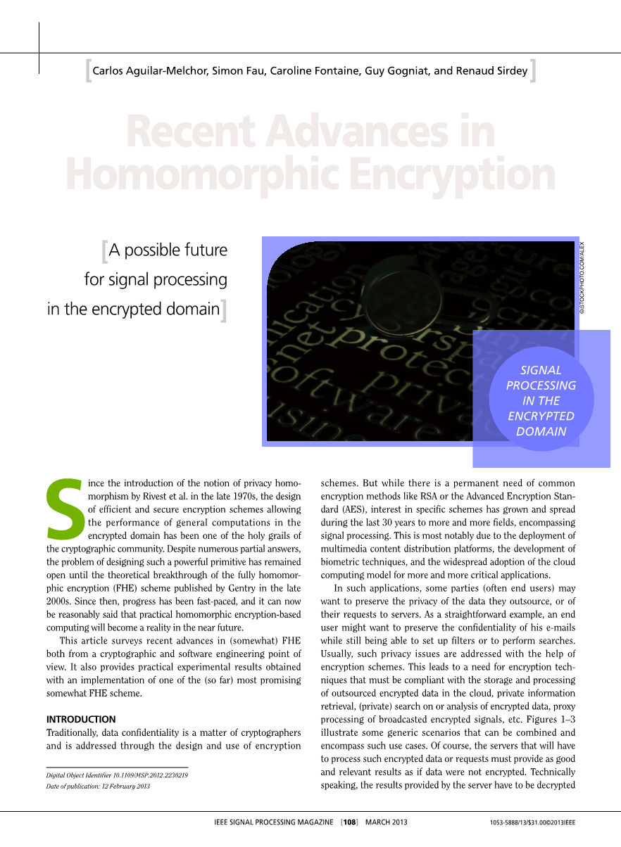 传统上,数据机密性是密码学家的问题,并且通过设计和使用加密方案来解决。 但是,尽管存在对诸如RSA或高级加密标准(AES)的常见加密方法的永久需要,但是在过去30年中对特定方案的兴趣已经增长并且扩展到越来越多的领域,包括信号处理。 这尤其是由于多媒体内容分发平台的部署,生物测定技术的发展以及云计算模型对越来越关键的应用的广泛采用。