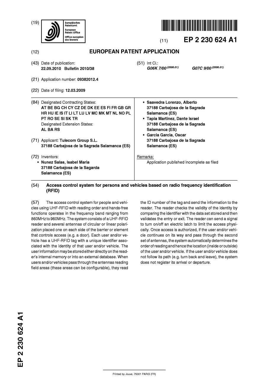 申请人:Tulecom Group SL 37188 Carbajosa德拉萨格拉达萨拉曼卡(ES)