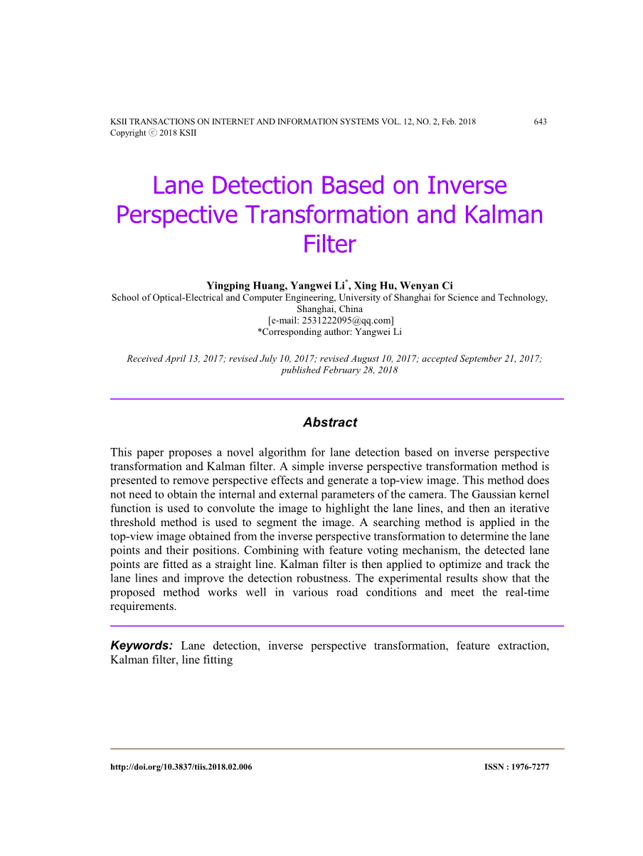 摘要:提出了一种新的基于逆向透视变换和卡尔曼滤波的车道检测算法。摘要提出了一种简单的反透视变换方法。效果和生成一个顶视图图像。该方法不需要获取摄像机的内外参数。用高斯核函数将图像卷积到高。对车道线点亮,然后采用迭代阈值法对图像进行分割。将搜索方法应用于由逆透视变换到d的上视图图像中。远距离的车道点和他们的位置。结合特征投票机制,将检测到的车道点拟合成一条直线。然后应用卡尔曼滤波对l进行优化和跟踪。提高了检测的鲁棒性。实验结果表明,该方法在各种路面条件下均能很好地满足实时性要求。