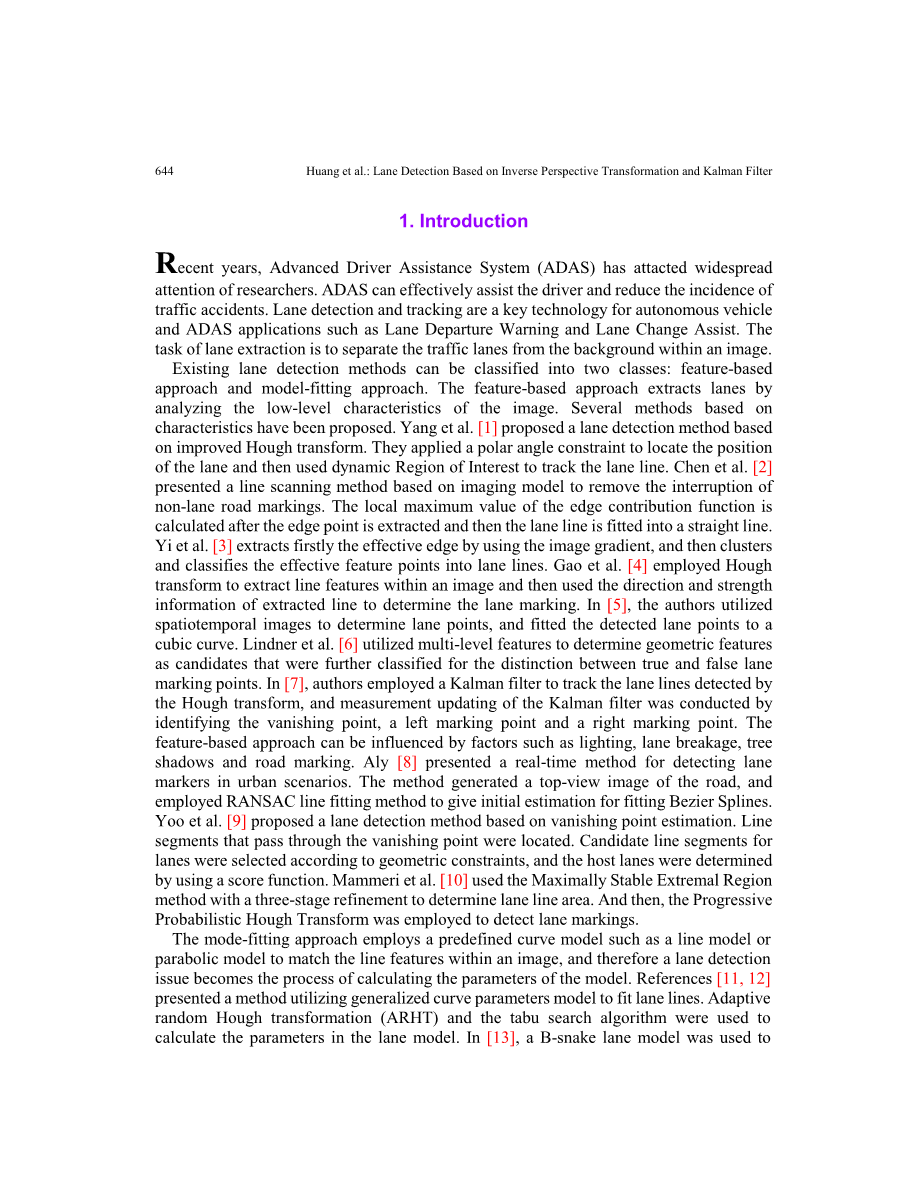 现有的车道检测方法可分为两类:基于特征的方法和模型拟合方法。.基于特征的方法通过分析图像的低级特征来提取通道。已经提出了几种基于特征的方法。Yang等人[1]提出了一种基于改进Hough变换的车道检测方法。他们应用极角约束来定位车道的位置,然后使用感兴趣的动态区域来跟踪车道线。Chen等人[2]提出了一种基于成像模型的线扫描方法来消除非车道道路标记的中断。在提取边缘点之后计算边缘贡献函数的局部最大值,然后将车道线拟合成直线。Yi等人[3]首先利用图像梯度提取有效边缘,然后对有效特征点进行聚类,再将有效特征点分类为车道线。Gao等人[4]采用霍夫变换来提取图像中的线条特征,然后使用提取线的方向和强度信息来确定车道标记。在[5]中,作者利用时空图像来确定车道点,并将检测到的车道点拟合成三次曲线。Lindner等人[6]利用多级特征来确定几何特征作为进一步分类的真实和假的车道标记点之间的区别。在文献[7]中,作者采用卡尔曼滤波器跟踪由霍夫变换检测到的车道线,并通过识别消失点,左标记点和右标记点来进行卡尔曼滤波器的测量更新。基于特征的方法可能受到诸如照明,车道破损,树荫和道路标记等因素的影响。Aly[8]提出了一种在城市场景中检测车道标记的实时方法。该方法生成了道路的俯视图像,并采用RANSAC线拟合方法给出拟合B样条曲线的初始估计。Yoo等人[9]提出了基于消失点估计的车道检测方法。通过消失点的线段位于。根据几何约束选择车道的候选线段,并使用得分函数确定主车道。Mammeri等人[10]采用最大稳定极值区域法进行三阶段细化以确定车道线区域。然后,采用渐进概率霍夫变换来检测车道标记。