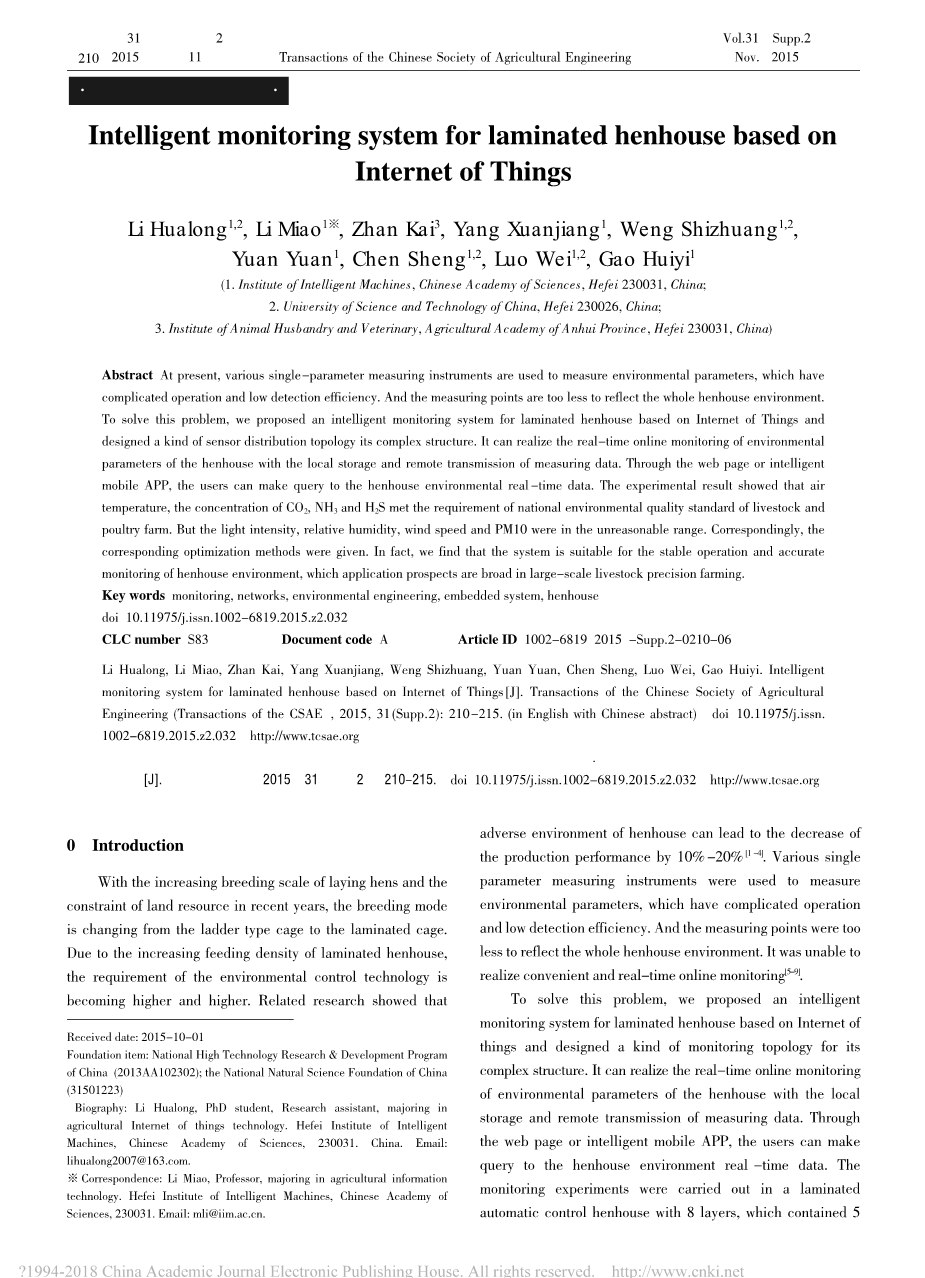 李华龙李淼詹凯杨选江翁世庄袁远陈胜罗伟高慧一 基于物联网的层叠式鸡舍智能监控系统[J]。中国农业工程学会学报(社会科学版),2015,31(Supp.2):210-215。 (英文和中文摘要)doi:10.11975 / j.issn。 1002-6819.2015.z2.032http://www.tcsae.org