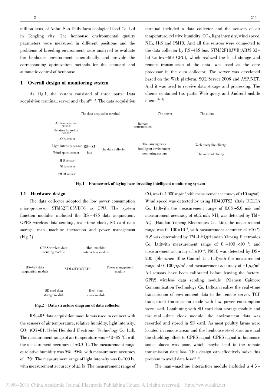 终端包括数据采集器和空气温度,相对湿度,CO2,光强度,风速,NH3,H2S和PM10等传感器。所有的传感器都通过RS-485总线连接到数据采集器。实现数据的本地存储和远程传输的STM32F103VB(ARM 32位Cortex-M3 CPU)被用作数据采集器中的核心处理器。该服务器是基于Web平台,SQL Server 2008和ASP.NET开发的。它用于接收数据存储和处理。客户端包含两部分:Web查询和Android手机客户 [13-15].