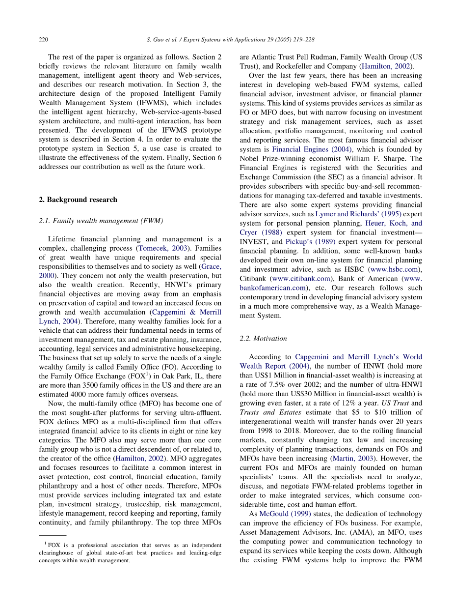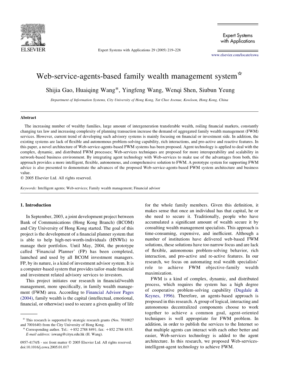 论文的其余部分按以下方式组织。第二节简要回顾了家庭财富管理、智能代理理论和web服务的相关文献,并对我们的研究moti进行了介绍。 vation。第三部分,提出的智能家族财富管理系统(IFWMS)的体系结构设计,包括智能Agent层次结构、基于Web服务的系统archi。 提出了多智能体交互的结构和多Agent交互机制.IFWMS原型系统的开发在第四节中作了介绍。为了评估第5节中的原型系统,用例是 用来说明系统的有效性。最后,第6节讨论了我们的贡献以及今后的工作。