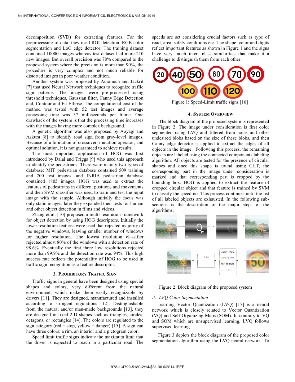 本文提出了一种检测速度的新方法限制交通标息志具有更强的稳健性。这篇论文是基于LVQ的颜色分割,圆形霍夫转换为圆检测,特征提取使用HOG和最后的SVM分类器对不同的分类限速交通标志和非限速标志。