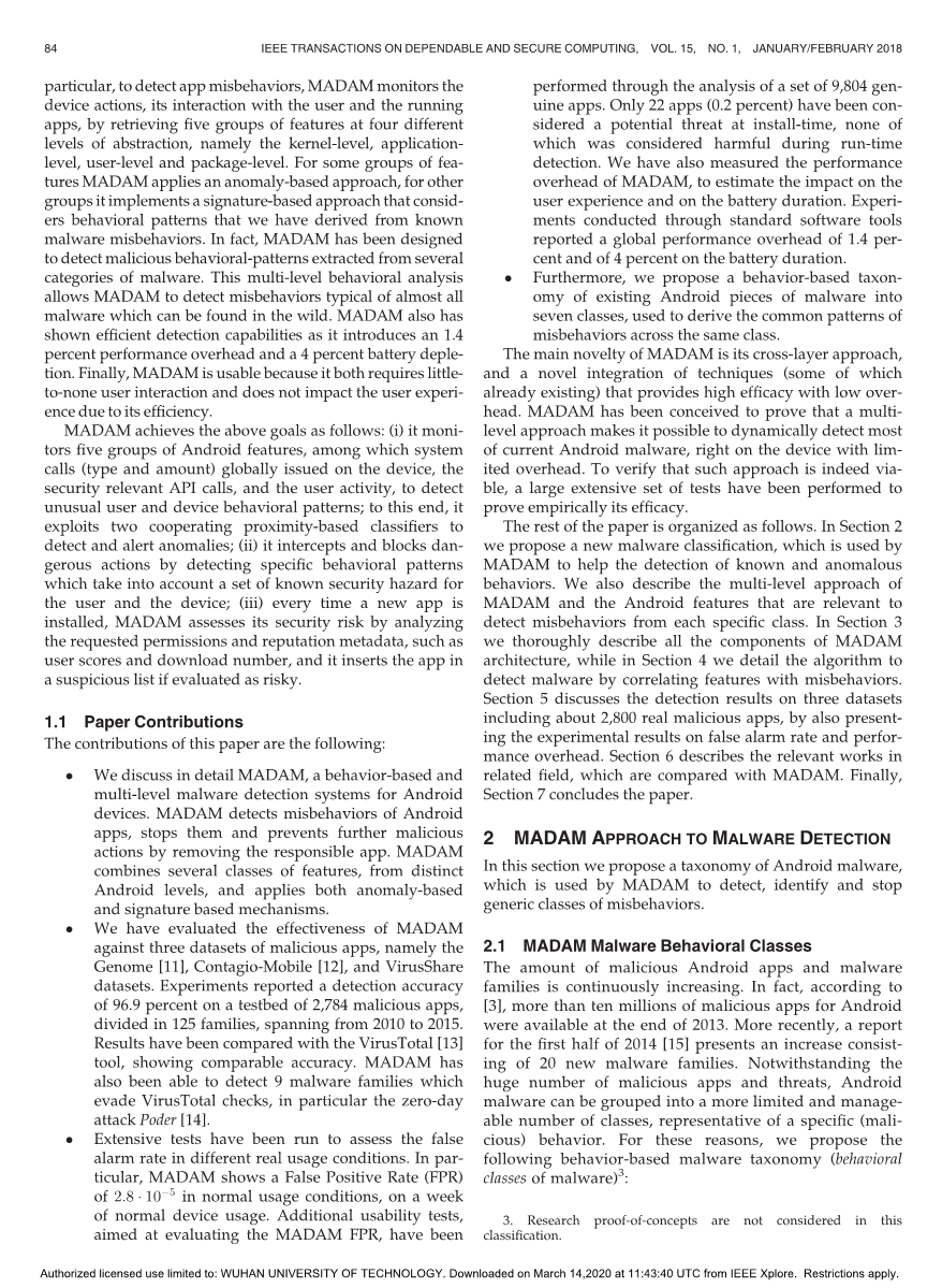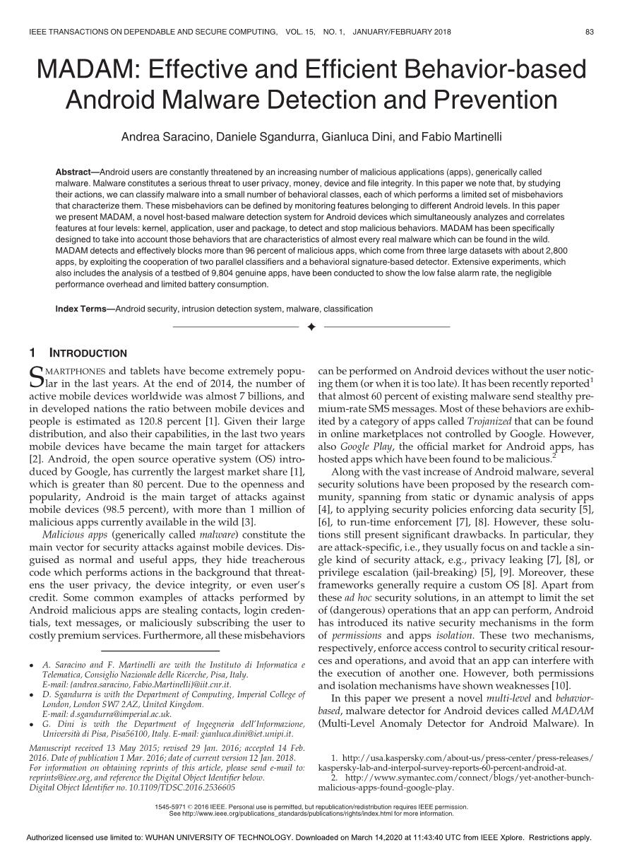 1.1论文贡献本文的贡献如下:1详细讨论了一种基于行为的Android设备多级恶意软件检测系统MADAM。MADAM检测Android应用程序的恶意软件,阻止它们,并通过删除负责的应用程序来防止进一步的恶意操作。MADAM结合了来自不同Android级别的几类特性,并应用了基于异常和基于签名的机制。我们已经针对三个恶意应用程序的数据集,即基因组[11]、传染性移动设备[12]和病毒共享数据集,评估了MADAM的有效性。实验报告称,从2010年到2015年,在一个由2784个恶意应用程序组成的测试平台上,检测准确率达到96.9%,这些应用程序分为125个家族。结果已与VirusTotal[13]工具进行了比较,显示了相当的准确性。MADAM还检测到9个恶意软件家族逃脱了病毒总数检查,特别是零日攻击程序[14]。在不同的实际使用条件下,已经进行了大量的测试来评估虚警率。特别是,在正常使用设备的一周内,在正常使用条件下,MADAM显示的假阳性率(FPR)为2:8,10,45。额外的可用性测试,旨在评估MADAM 通过对9804个正版应用程序的分析。只有22个应用程序(0.2%)在安装时被认为是潜在威胁,在运行时检测期间没有一个被认为是有害的。我们还测量了MADAM的性能开销,以估计对用户体验和电池续航时间的影响。通过标准软件工具进行的实验表明,在电池续航时间方面,全球性能开销分别为1.4%和4%。此外,我们提出了一个基于行为的分类法,将现有的Android恶意软件分为七个类,用于派生同一类中常见的错误行为模式。MADAM的主要新颖之处在于它的跨层方法,以及一种新的技术集成(其中一些技术已经存在),它以低开销提供高效率。MADAM被认为是为了证明多层次的方法可以在有限的开销下在设备上动态检测当前的大部分Android恶意软件。为了验证这种方法确实是可行的,我们进行了一系列广泛的试验,从经验上证明了它的有效性。论文的其余部分安排如下:在第二节中,我们提出了一种新的恶意软件分类方法,用于帮助检测已知和异常行为。我们还描述了MADAM的多级方法和Android特性,这些特性与从每个speci c类中检测错误行为相关。在第3节中,我们详细描述了MADAM架构的所有组件,而在第4节中,我们详细介绍了通过将特征与错误行为关联起来来检测恶意软件的算法。第五节讨论了三个数据集的检测结果,包括2800个真实的恶意应用程序,并给出了虚警率和性能开销的实验结果。第六节介绍了相关领域的相关工作,并与夫人进行了比较。最后,第七节对本文进行了总结。