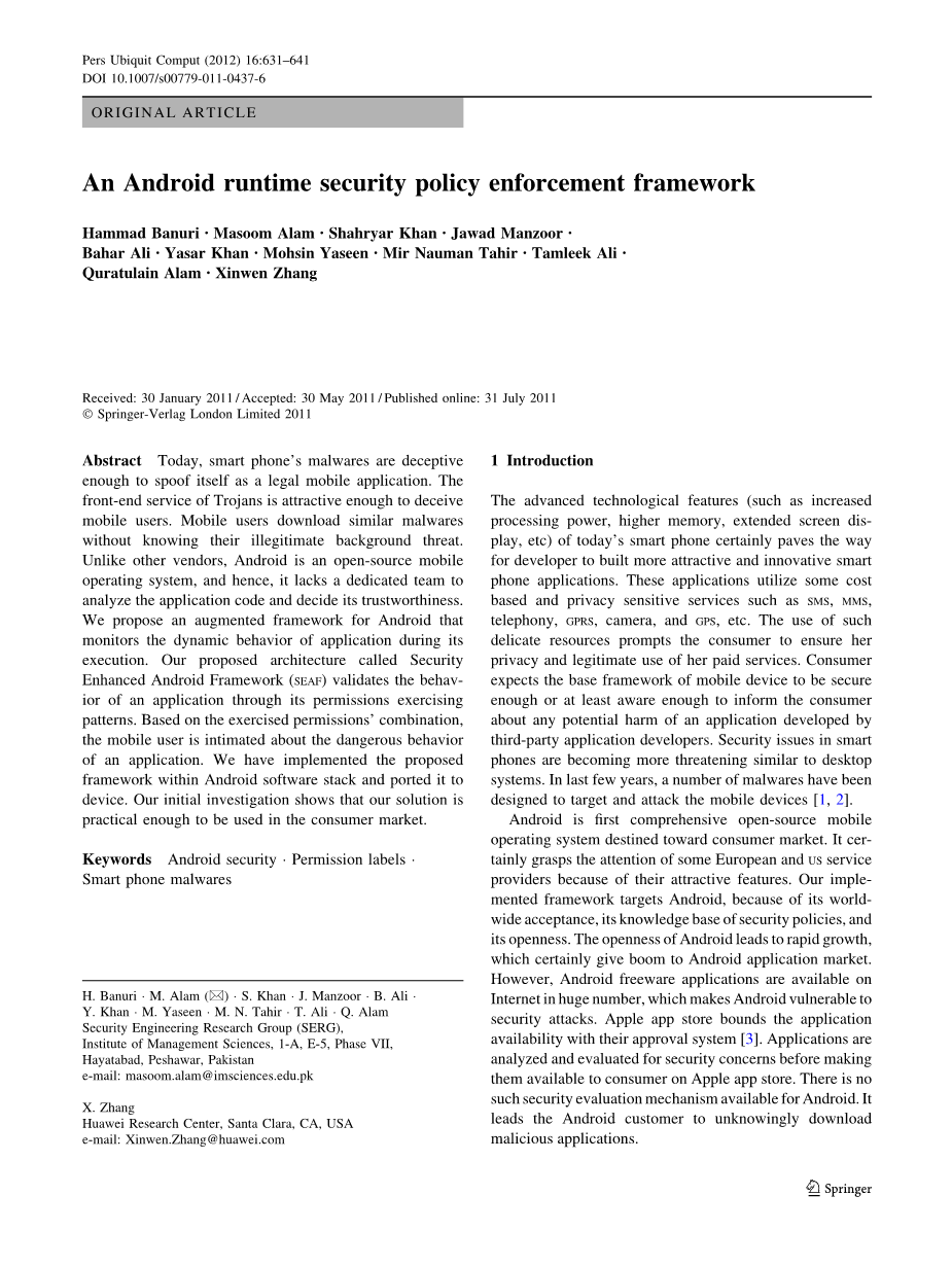 今天,智能手机的恶意软件是具有欺骗性的,足以伪装自己作为一个合法的移动应用程序。特洛伊木马的前端服务就足以吸引移动用户。移动用户下载类似的恶意软件,而不知道他们存在着威胁。与其他供应商不同,Android是一个开源移动操作系统,因此,它缺乏专门的团队来分析应用程序代码并决定其可信度。我们提出了一个用于监控应用程序执行期间的动态行为的Android增强框架。我们提出的架构称为安全增强的Android框架(seaf)通过其权限行使模式验证应用程序的行为。基于所行使的权限的组合,移动用户暗示关于应用的危险行为。我们已经在Android软件栈中实现了提出的框架,并将其移植到设备。根据我们的初步调查结果显示,我们的解决方案具有一定的实用性,可以用于消费市场。