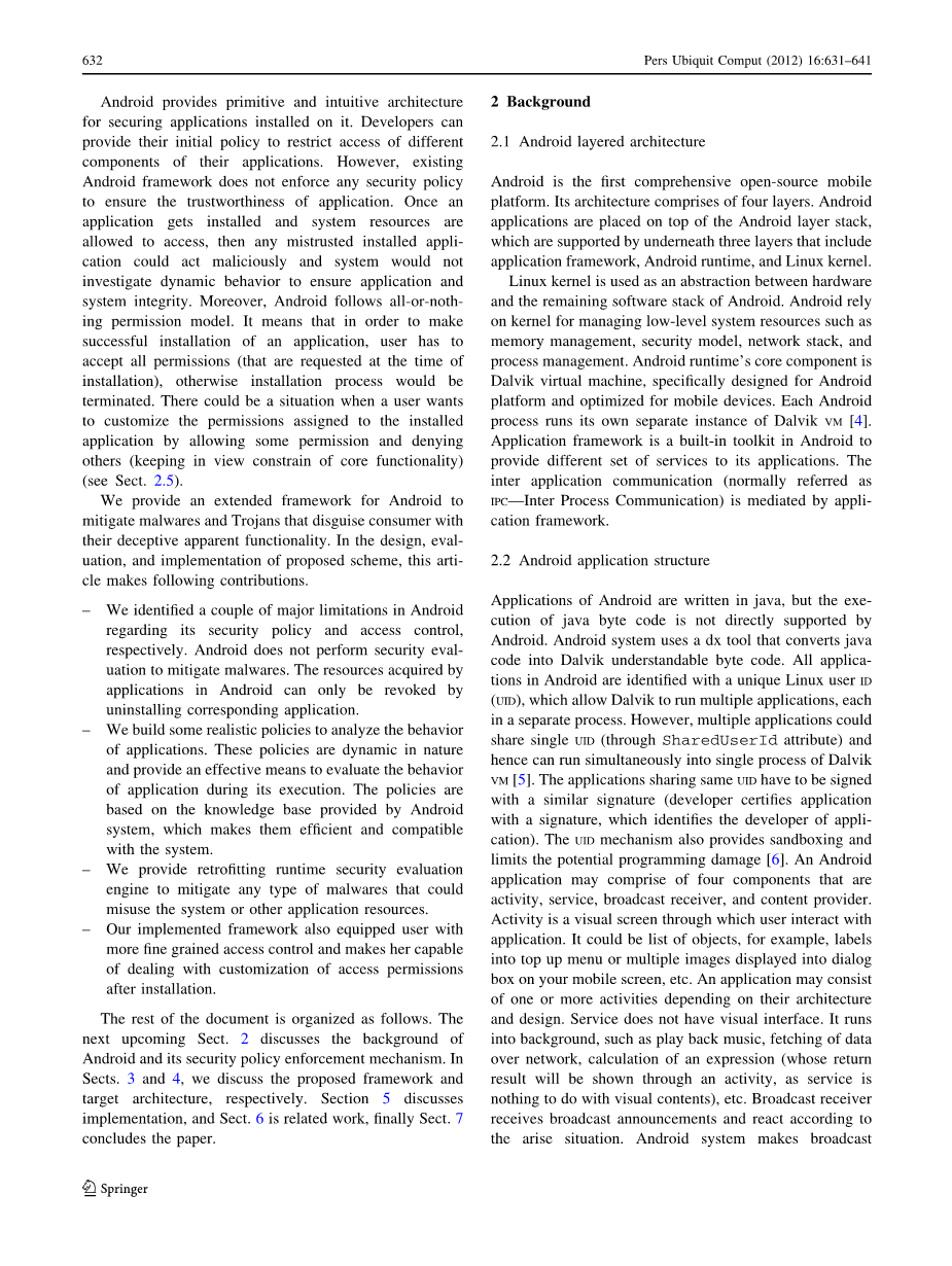 文档的其余部分组织如下:章节2讨论Android的背景及其安全策略实施机制;第3和4节,我们分别讨论提出的框架和目标架构; 第5节讨论实施,第6节是相关工作,最后是章节 7总结本文。