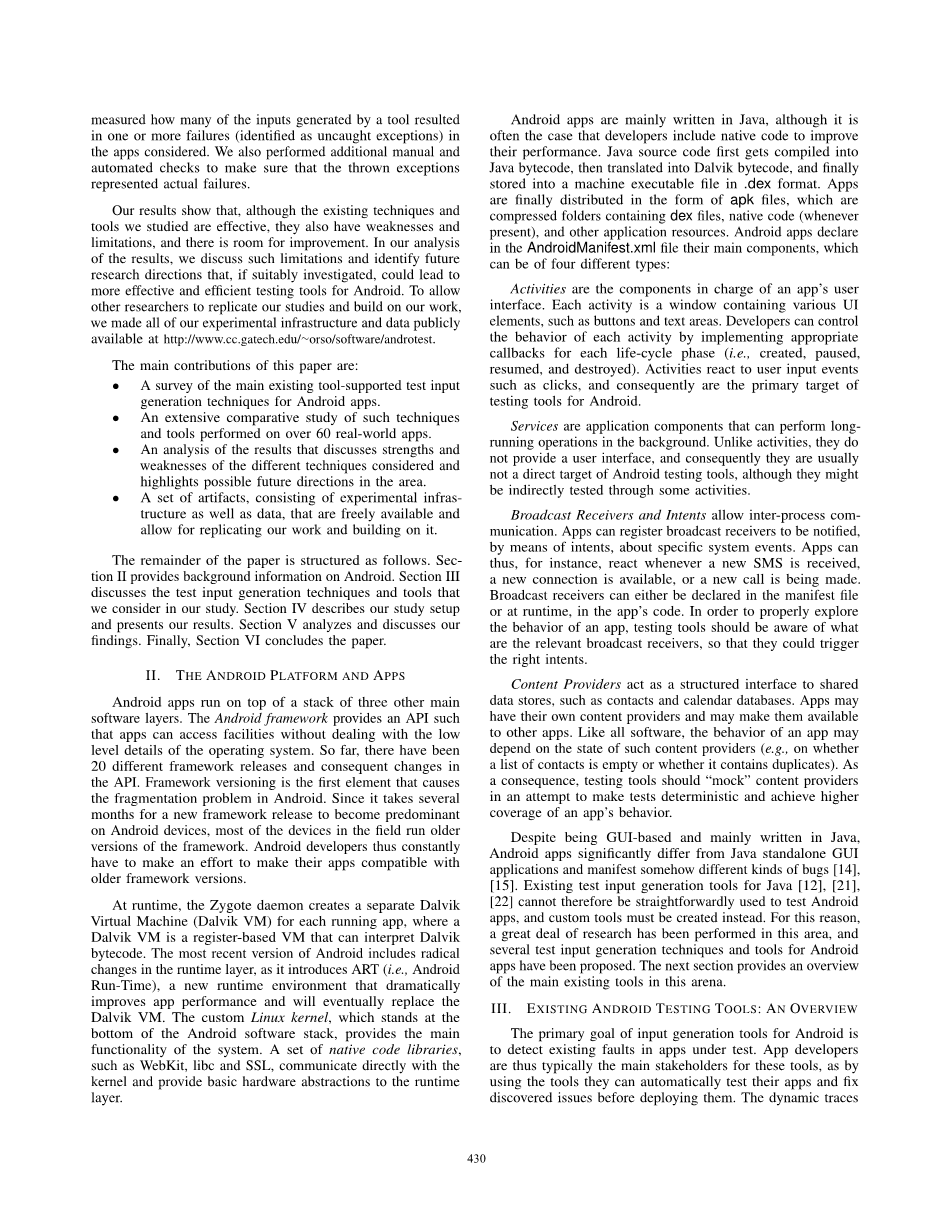 本文的其余部分结构如下。 第二部分提供Android的背景信息。 第三部分讨论我们在研究中考虑的测试输入生成技术和工具。 第四部分描述我们的研究设置并呈现我们的结果。 第五部分分析和讨论我们的发现。 最后,第六节总结了论文。
