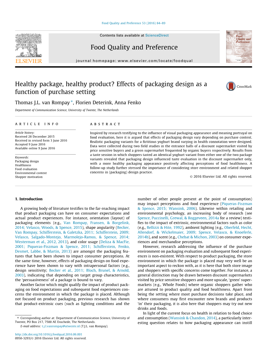 鉴于目前对食品选择和食用方面的健康的关注(Wansink&Chandon,2014),一个特别有趣的问题涉及包装外观如何灌输与健康有关的认知,以及这些是否转变为味道。 令人惊讶的是,很少有研究解决了视觉包装外观对健康感知的影响。 虽然研究已经解决了营养标签和健康声明对食物选择(例如,Aschemann-Witzel,Maroscheck,&Hamm,2013)和味道研究(Bialkova等人,2016,Lee等人,2013,Lotz等人 。2013年和Souml;rqvist等人,2016)的影响,解决了更隐性的视觉包装线索如何引导购物者评价味道样品作为健康的程度是不存在的。