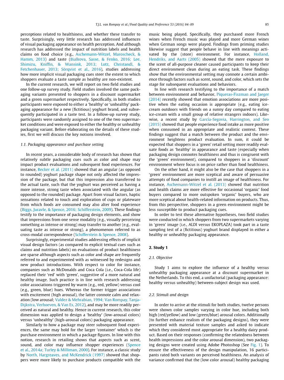 在目前的研究中,我们将报告两项实地研究和一项后续调查研究。 现场研究涉及向折扣超市和绿色超市购物者提供的相同包装变体。 具体来说,在两个研究中,参与者暴露于新的(虚构的)酸奶品牌的“健康”或“不健康”包装外观,并随后参与味道测试。 在随访调查研究中,参与者被随机分配到两个超市条件之一,并暴露于健康或不健康的包装变体。 在详细阐述这些研究的细节之前,首先我们将讨论所涉及的关键概念。